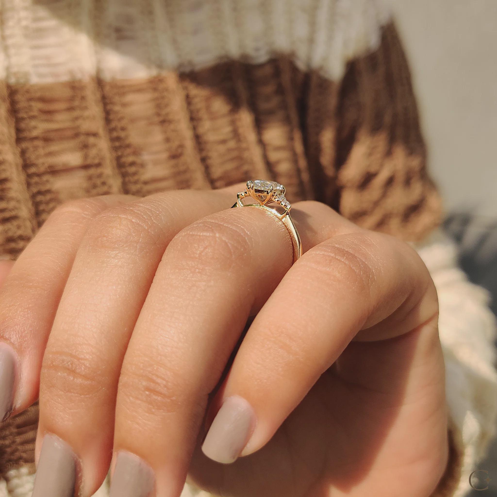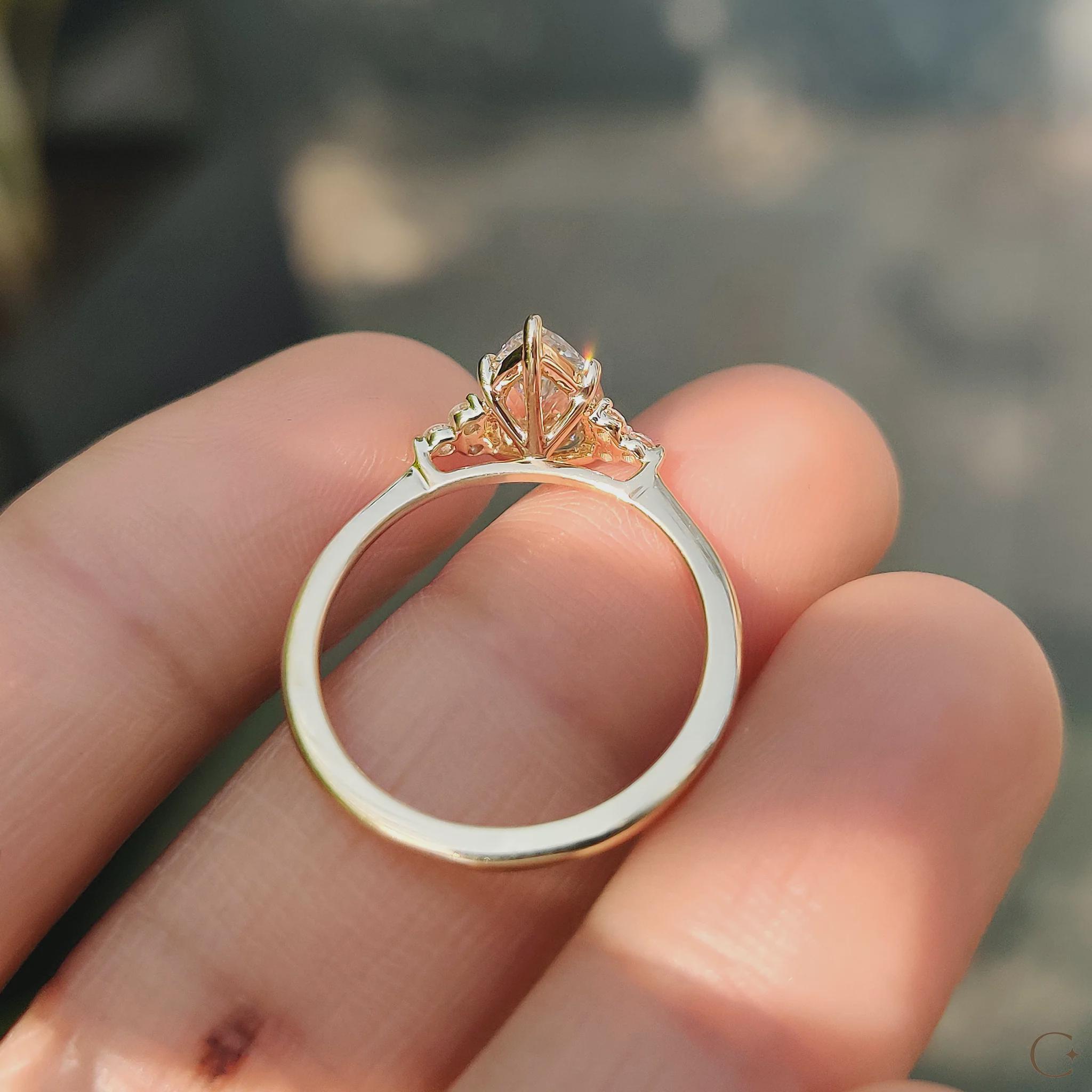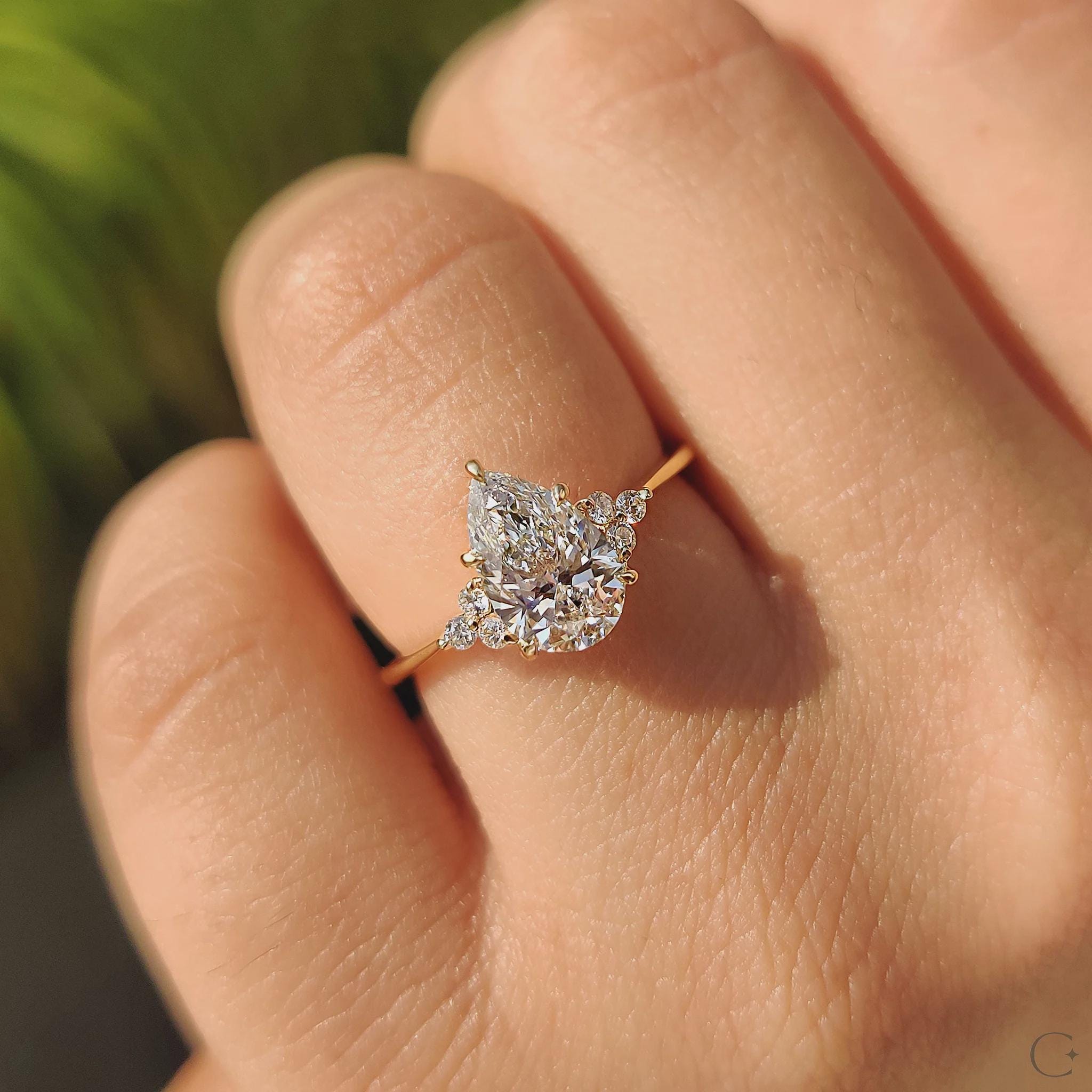 Pear Cut Moissanite Engagement Ring – a timeless expression of elegance and love. Handcrafted from solid 925 sterling silver, this stunning ring features a brilliant pear-shaped moissanite stone, surrounded by smaller sparkling accents that enhance its brilliance from every angle.