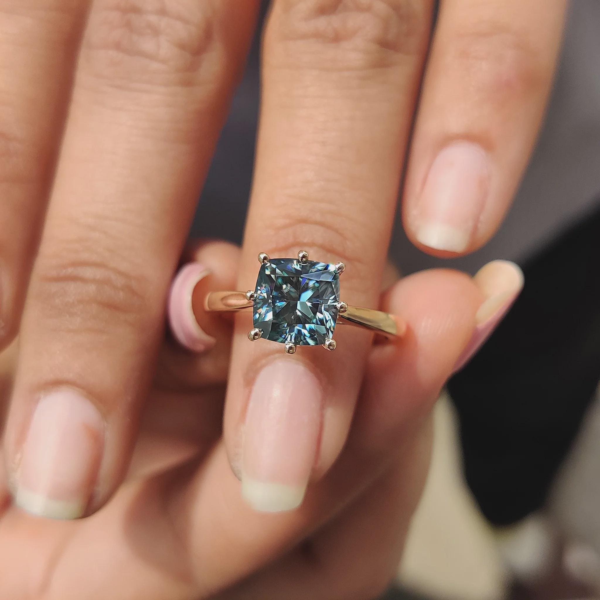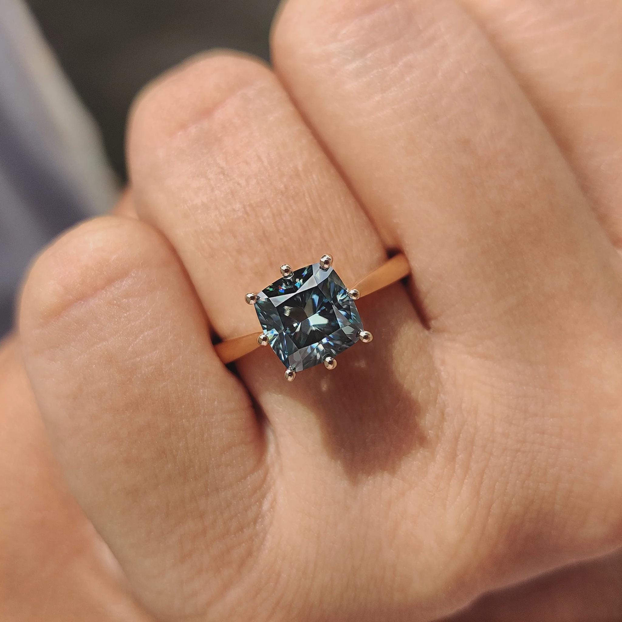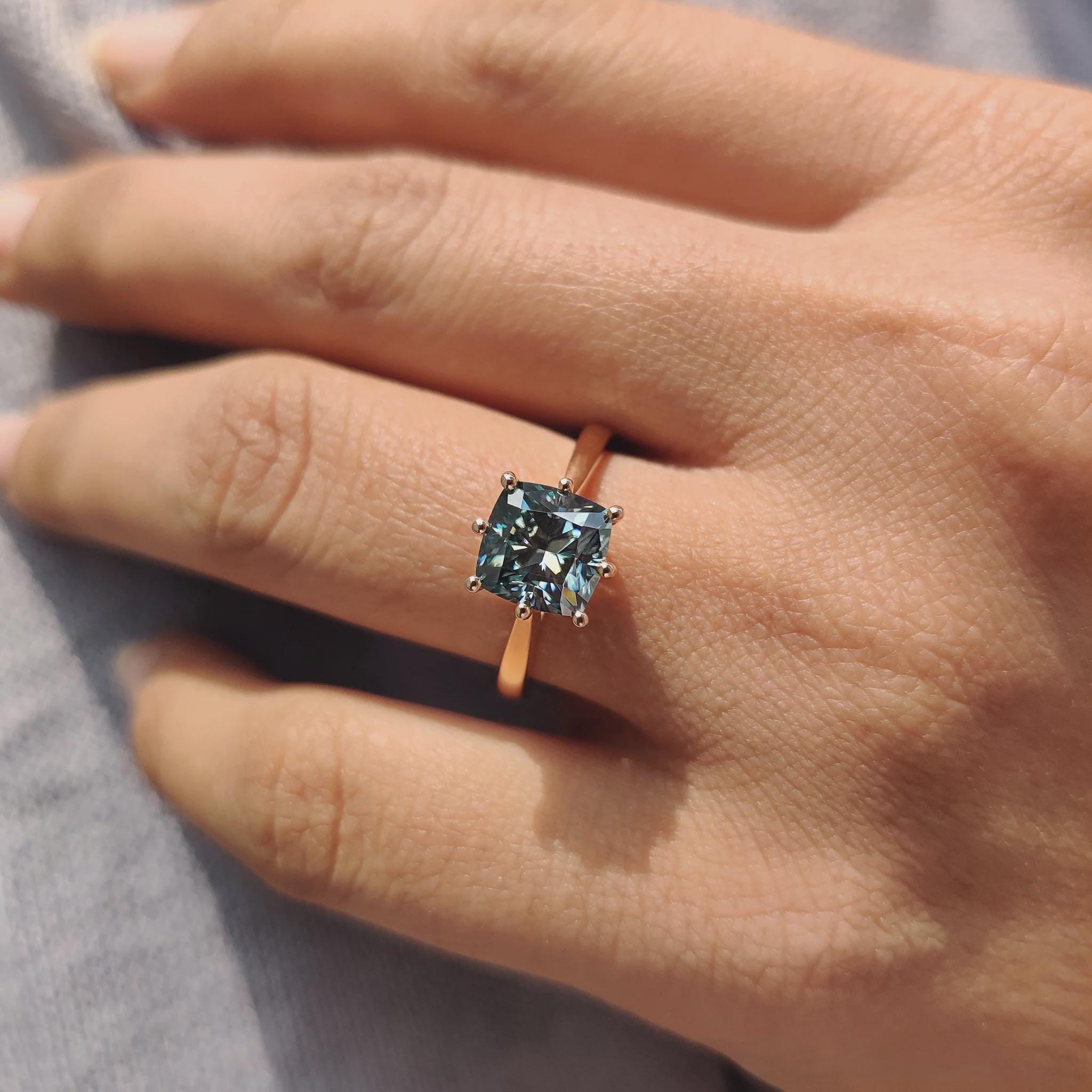 Cushion Cut Hidden Halo Moissanite Engagement Ring – a symbol of modern elegance and timeless romance. This exquisite ring features a dazzling cushion-cut moissanite center stone, gracefully elevated with a hidden halo setting that adds subtle sparkle from every angle.