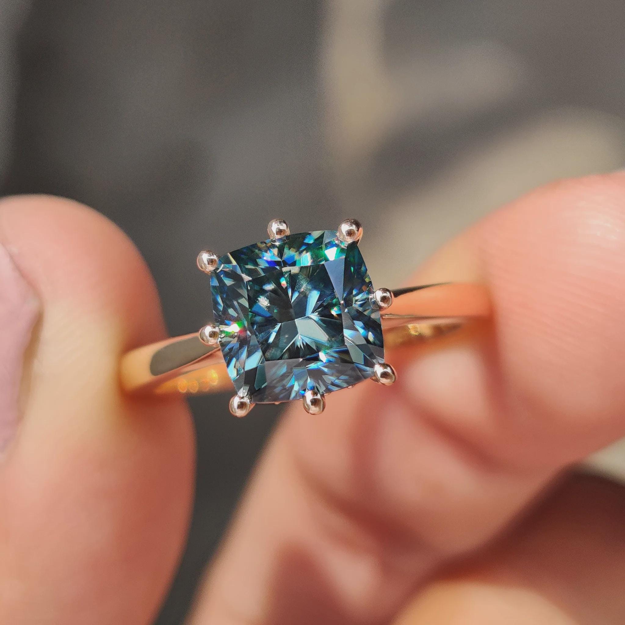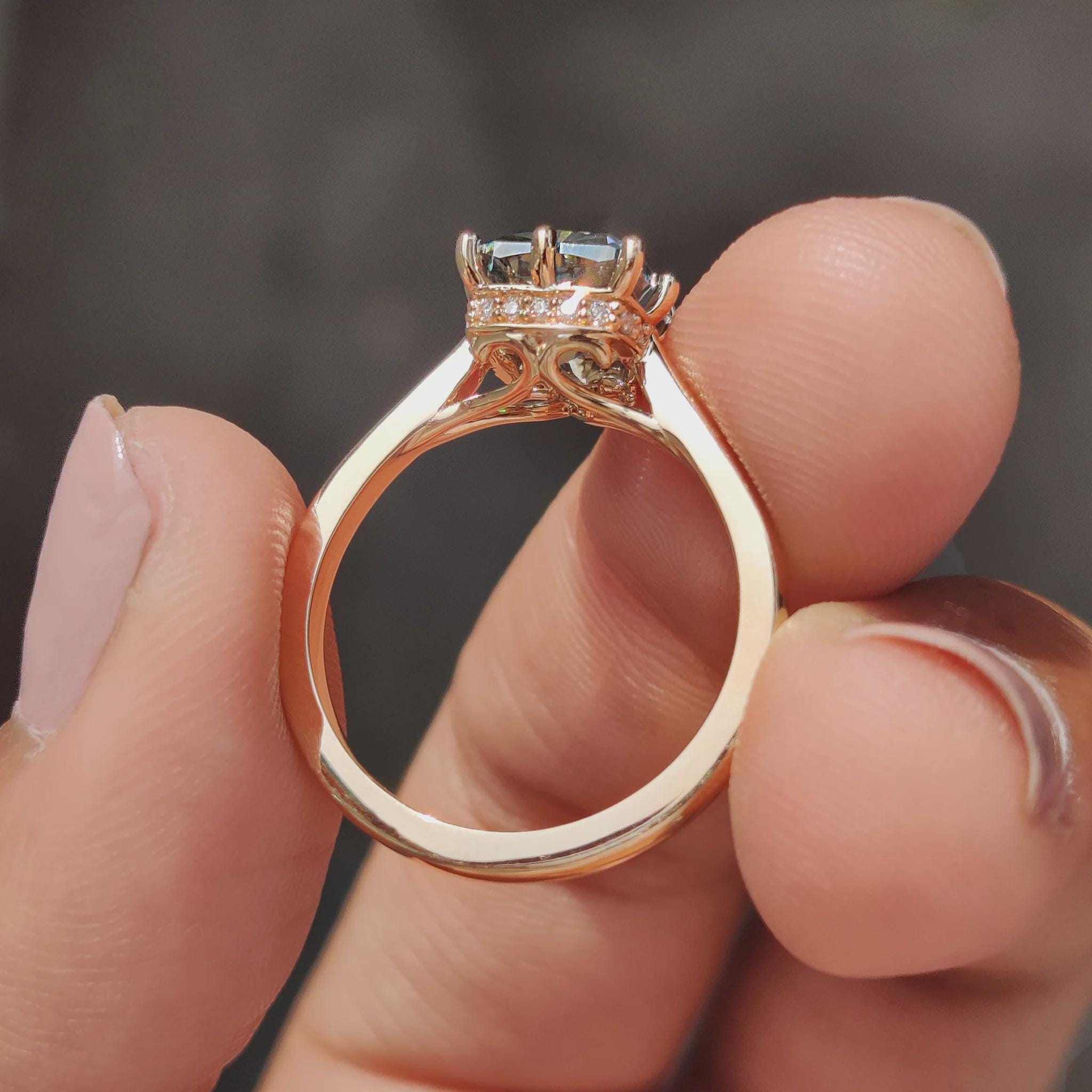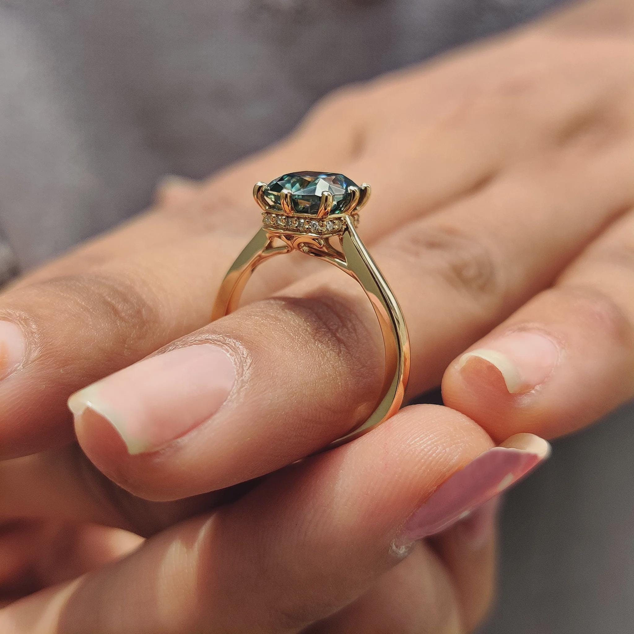 Cushion Cut Hidden Halo Moissanite Engagement Ring – a symbol of modern elegance and timeless romance. This exquisite ring features a dazzling cushion-cut moissanite center stone, gracefully elevated with a hidden halo setting that adds subtle sparkle from every angle.