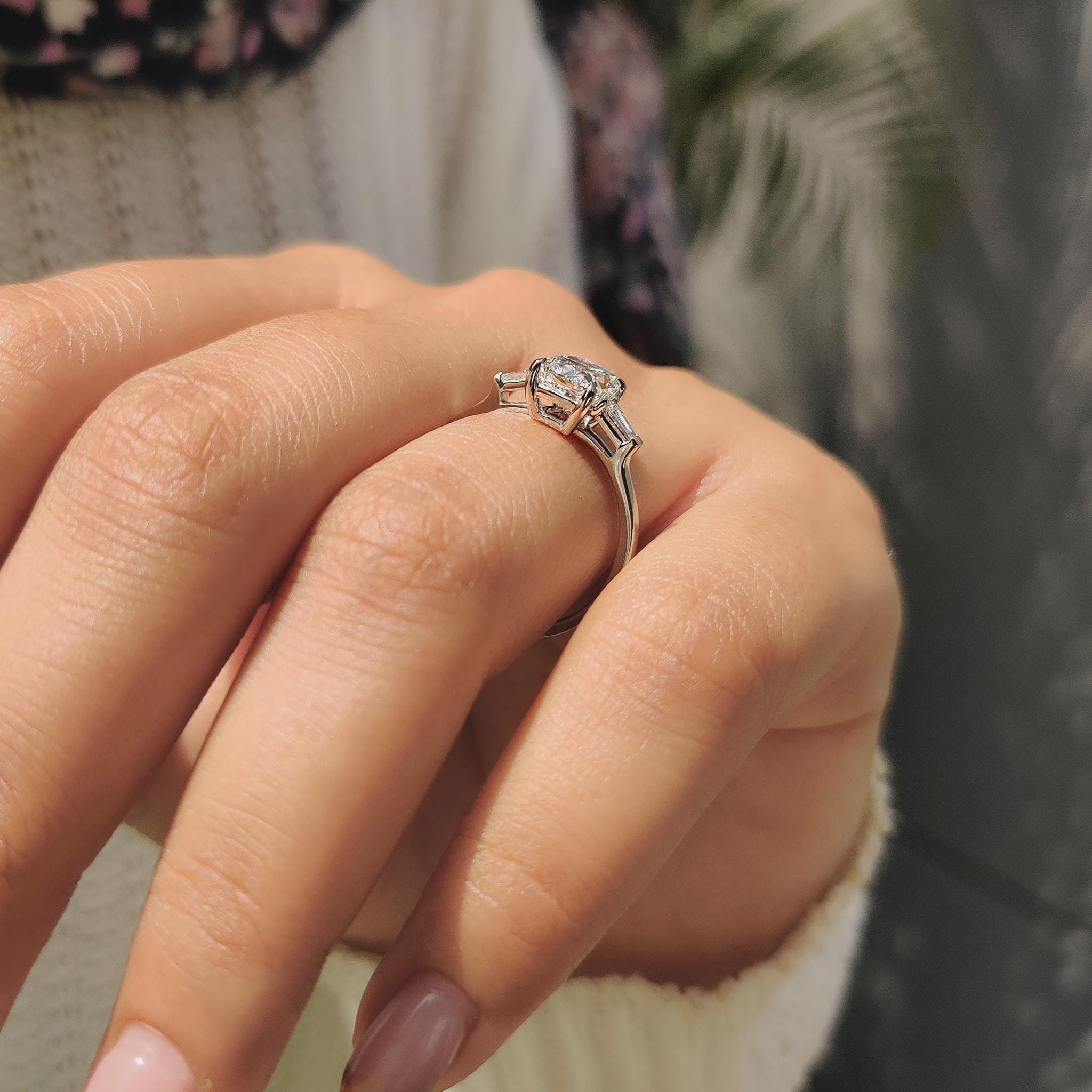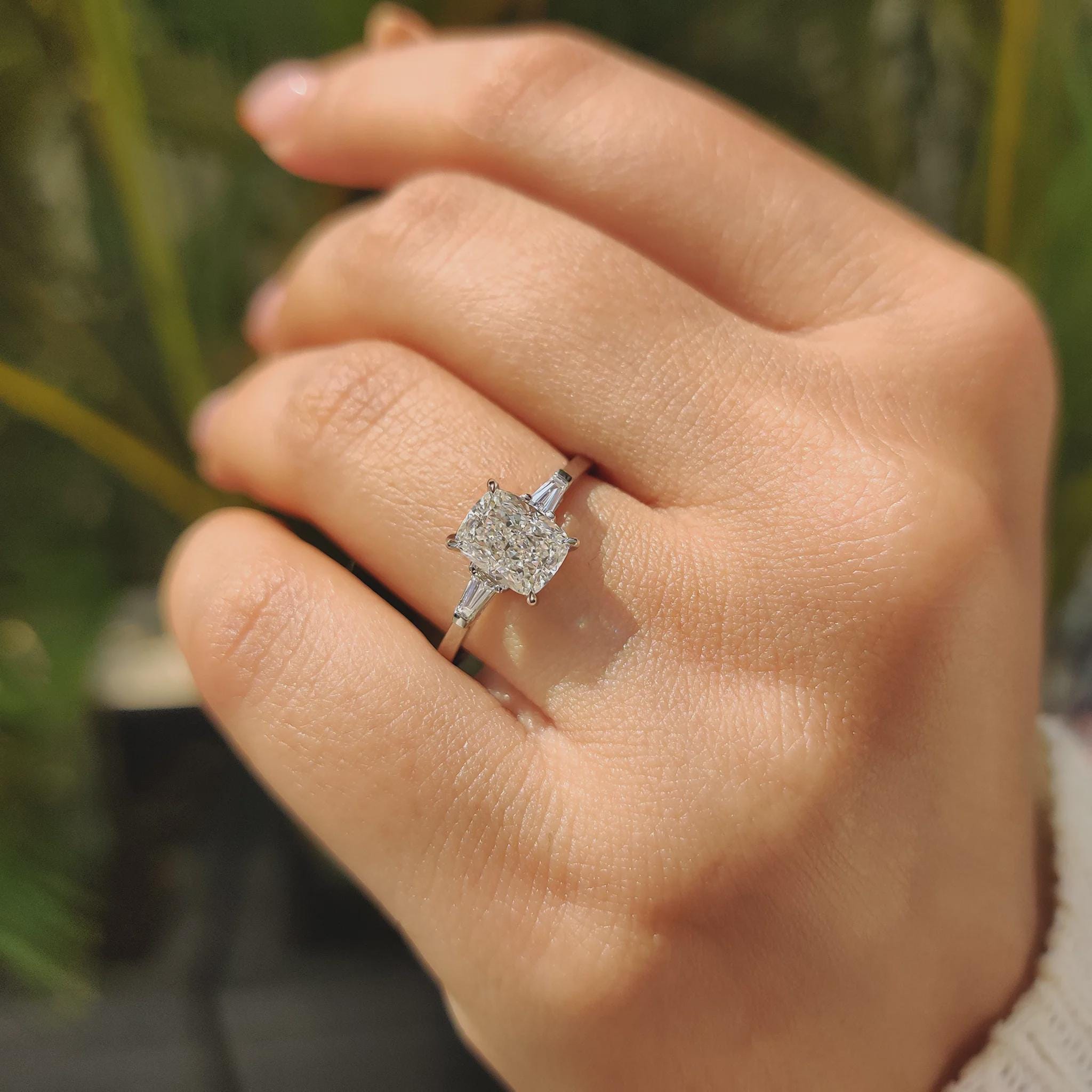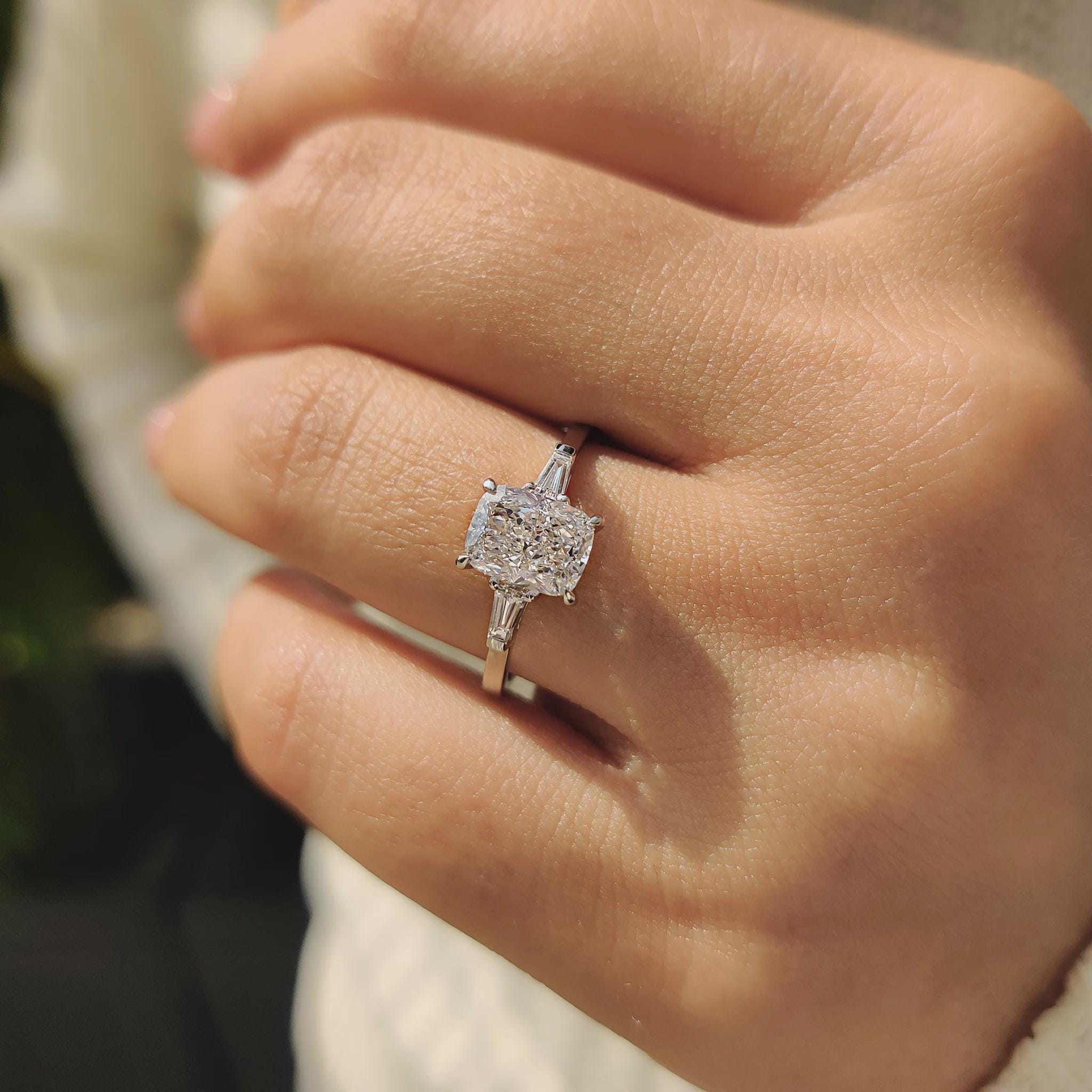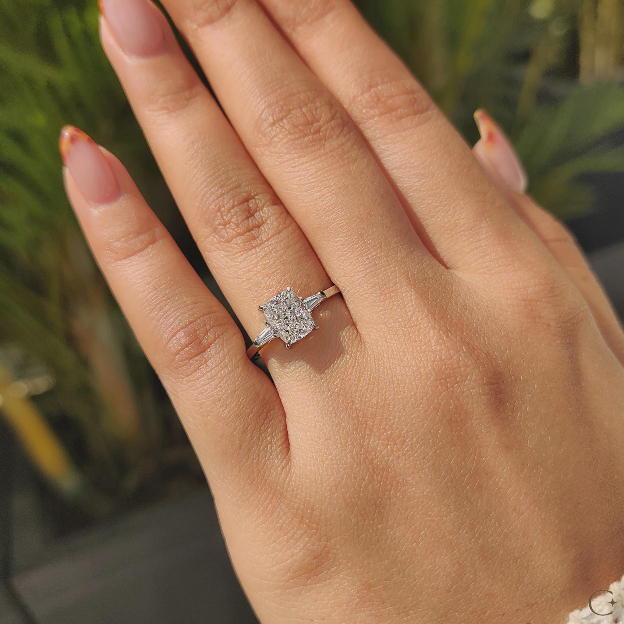 The 3 Stone Engagement Ring is a memorable gift for engagements, anniversaries, or any special occasion. Its significant design makes this gesture of affection unforgettable. This ring will be loved for years to come, whether your preference is for a Lab Grown Diamond or a classic stone. Cushion Cut Moissanite Engagement Ring – where timeless beauty meets modern craftsmanship. This exquisite ring features a radiant cushion-cut moissanite center stone, accented by tapered baguette side stones that create a perfect balance of sparkle and sophistication.