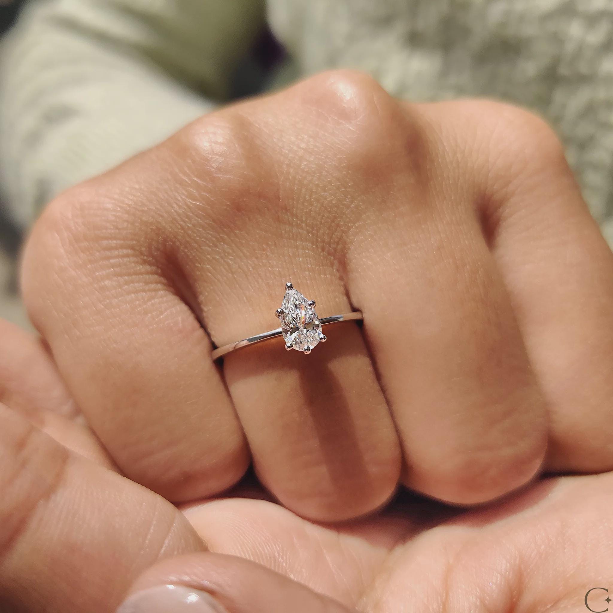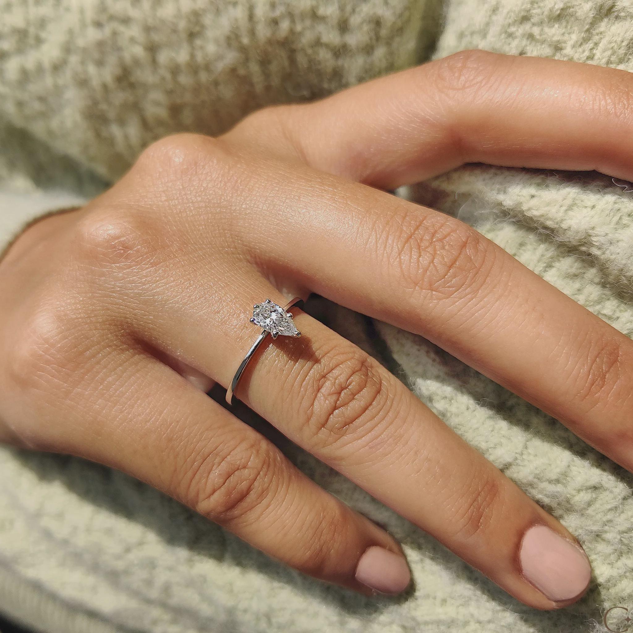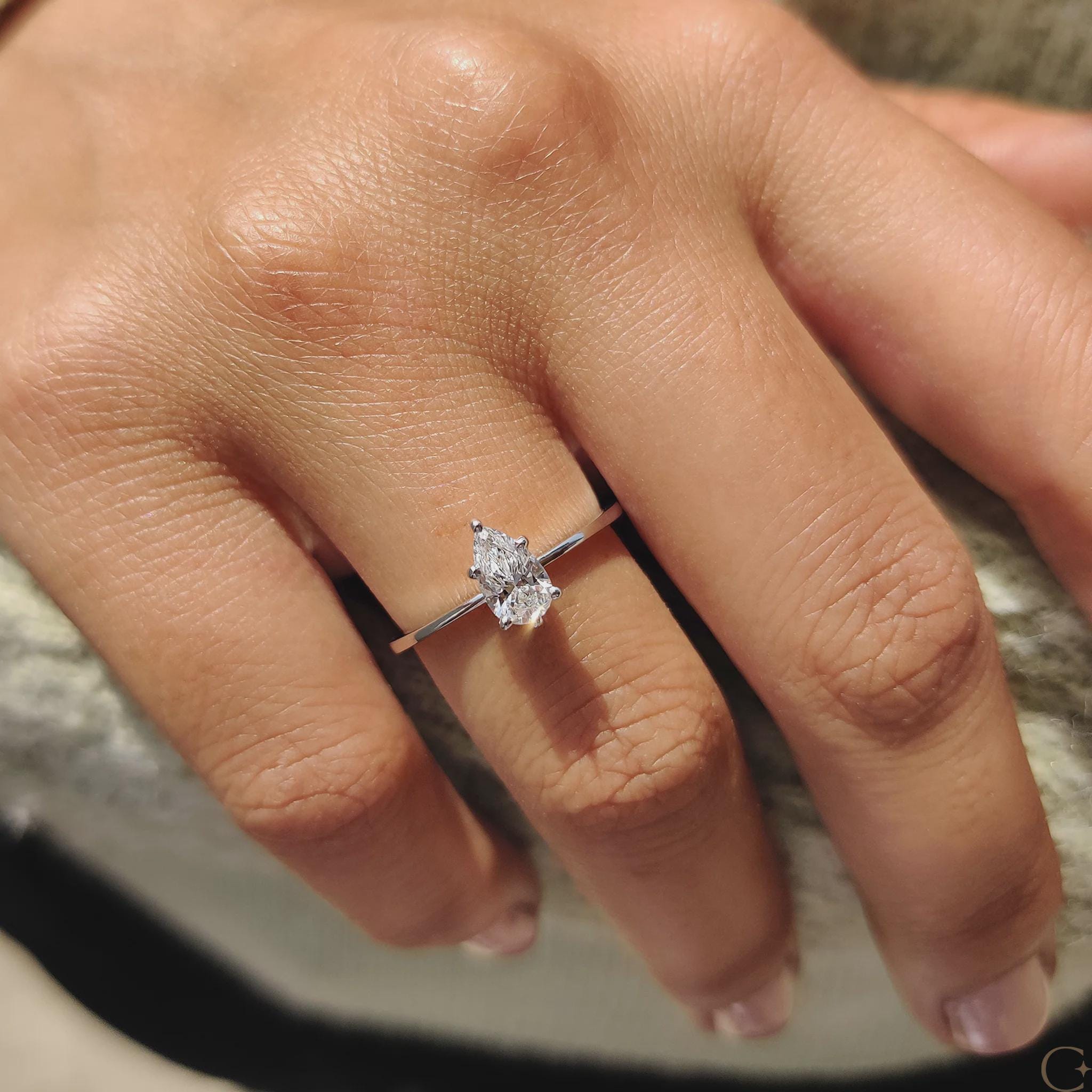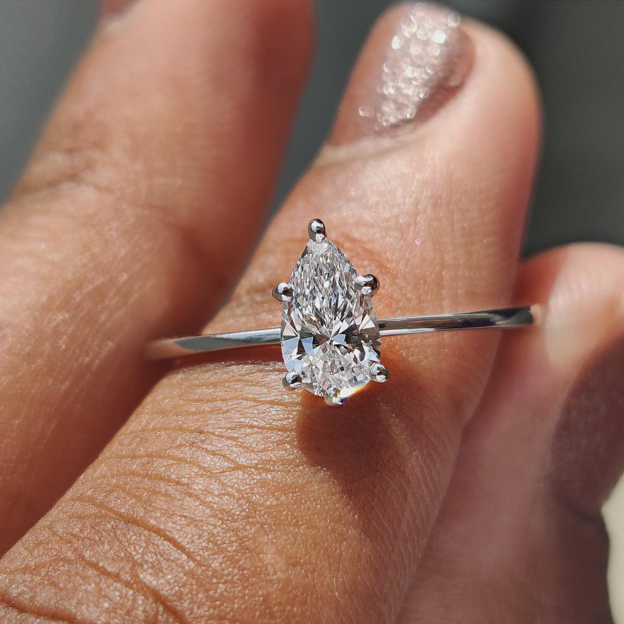 Pear Shaped Moissanite Solitaire Ring – a timeless expression of love, grace, and brilliance. Handcrafted from solid 925 sterling silver and finished with white gold plating, this elegant ring features a dazzling pear-cut moissanite stone in a classic solitaire setting.