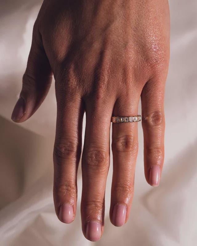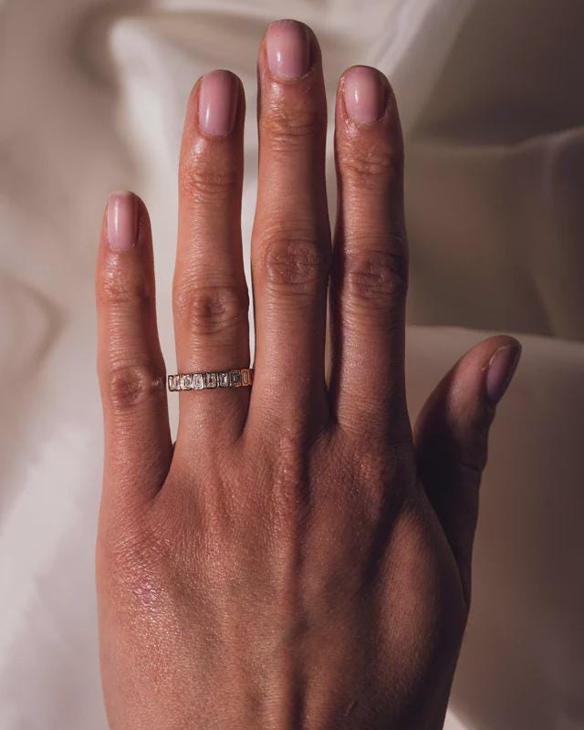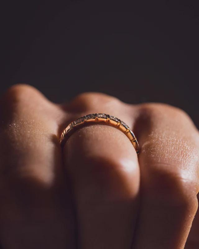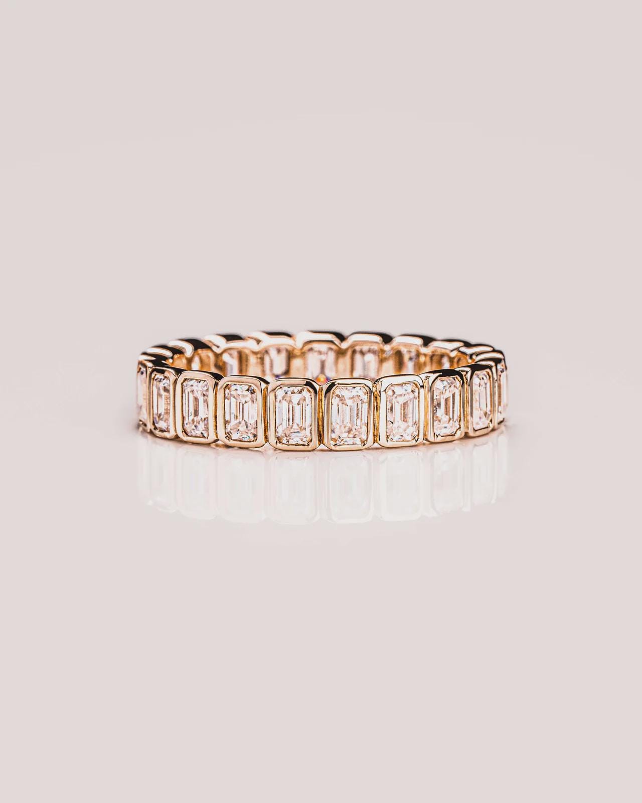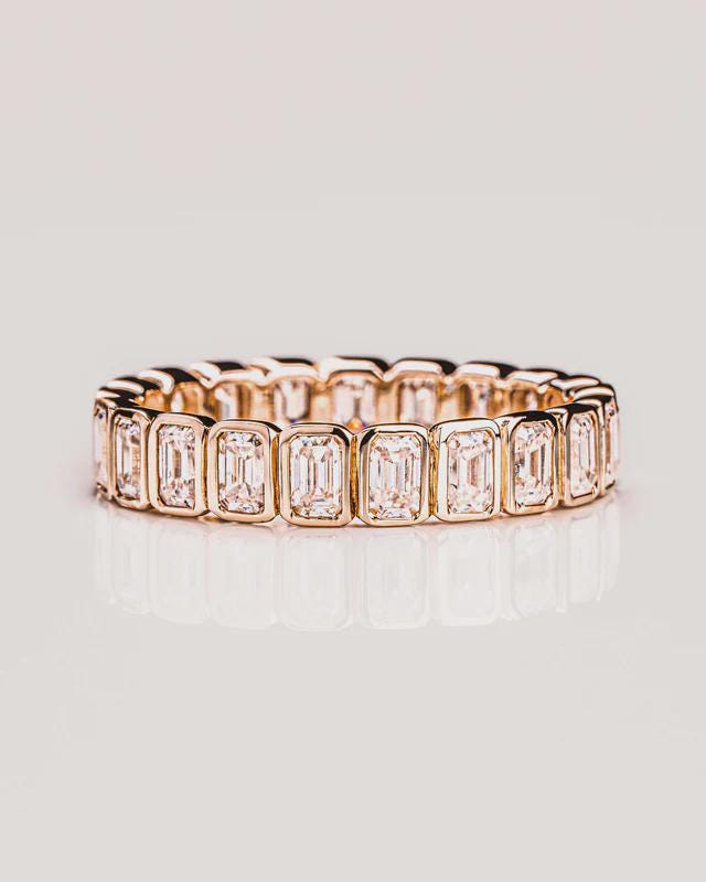 Demi – Emerald Eternity Band Ring Representing the perfect harmony of elegance and sparkle, this ring, with its emerald-cut stones, creates a ring of sparkle from beginning to end. The 14K rose gold plating, with its modern and warm tones, leaves a soft glow on the finger. This handcrafted design is perfect for those seeking understated elegance and those looking to dazzle on their special day. Wear it alone or paired with other rings—it creates a sense of timeless elegance with every look.