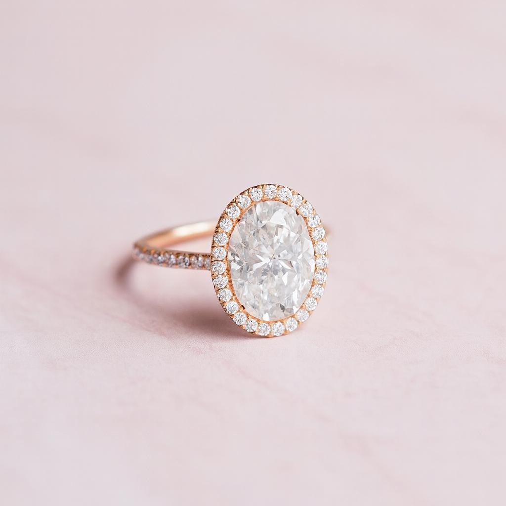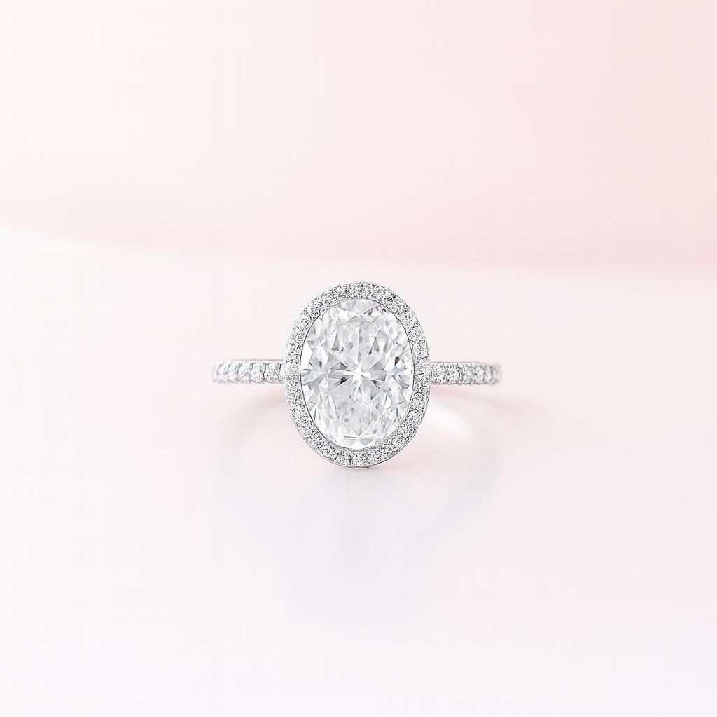 Center Stone: 3.0ct Oval Cut Moissanite (D Color, VVS1 Clarity)