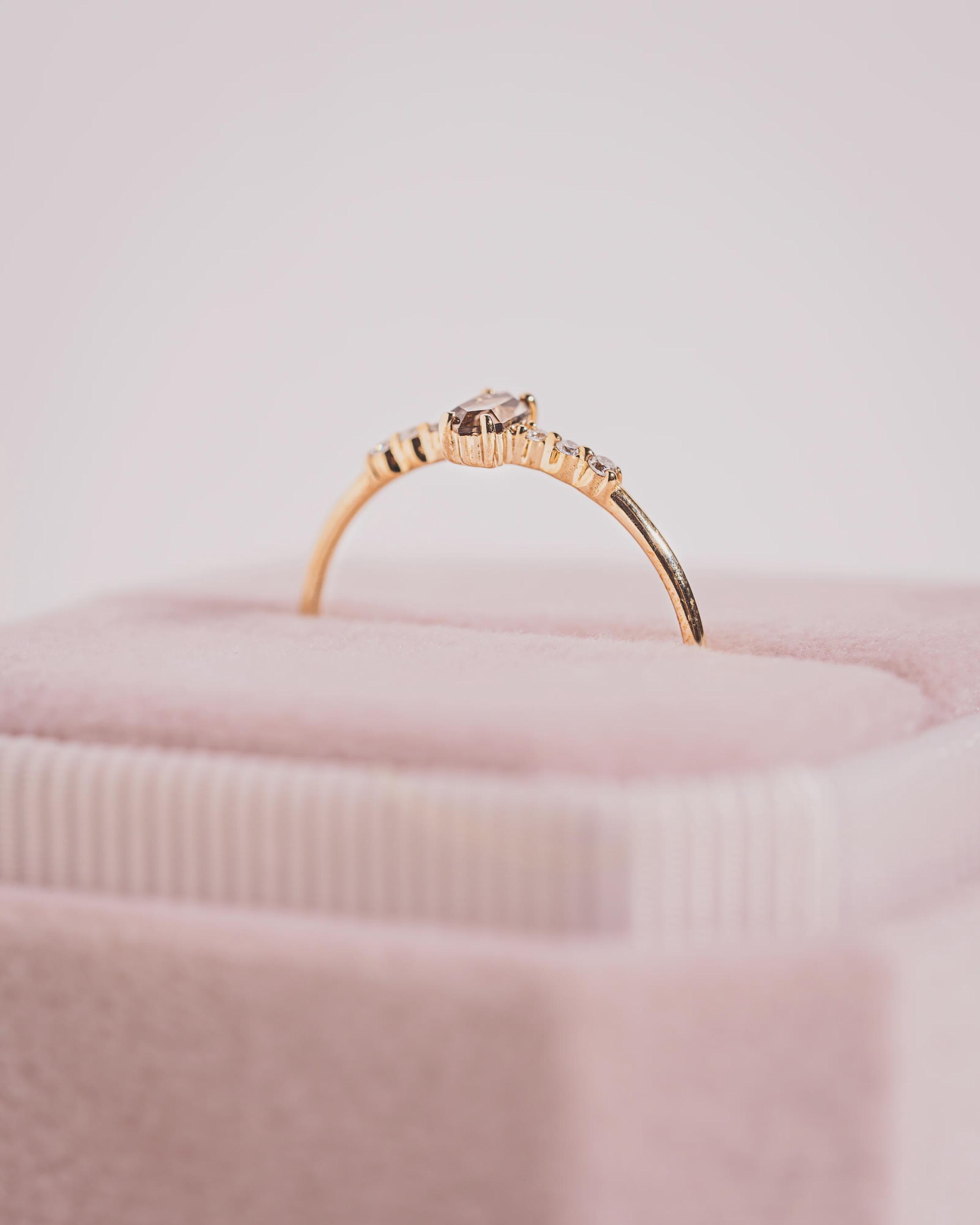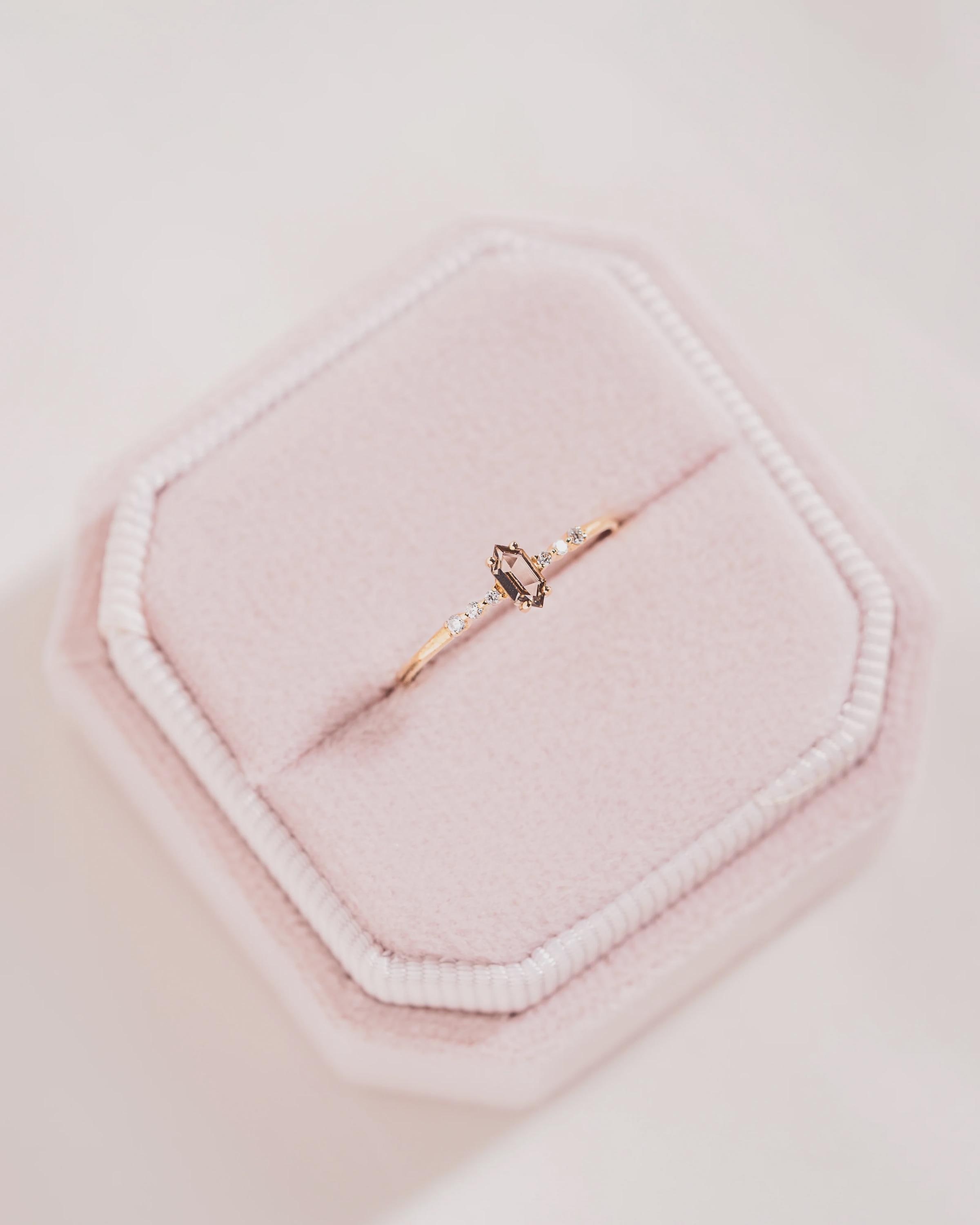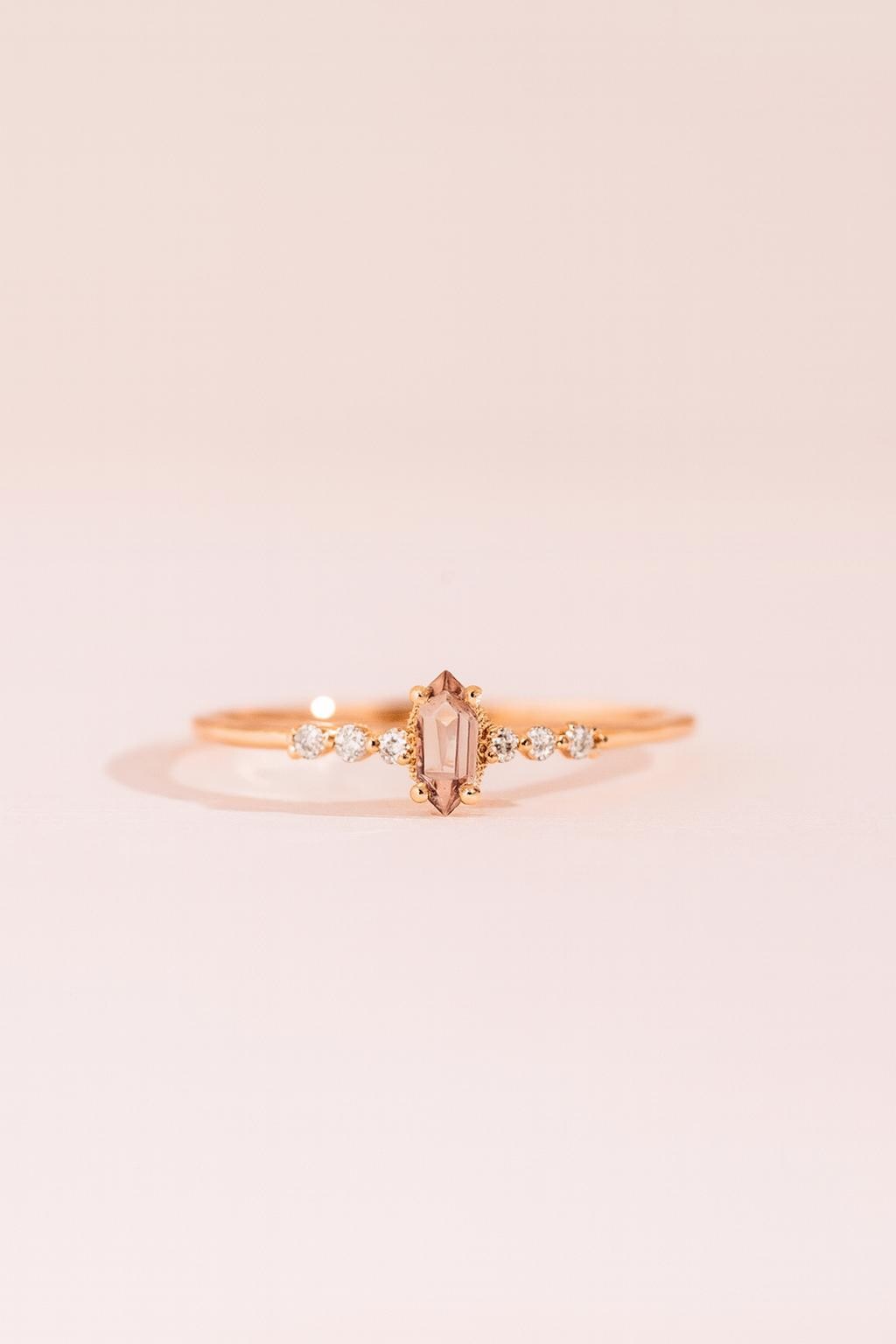 This elegant Hexagon Ring is a timeless symbol of love and grace. Crafted in 14K rose gold vermeil over solid 925 sterling silver, it features a hexagon-cut morganite stone at the center, accented by brilliant white cubic zirconia on both sides. Its slim, minimalist band gives a refined and feminine look — perfect for stacking or wearing solo.