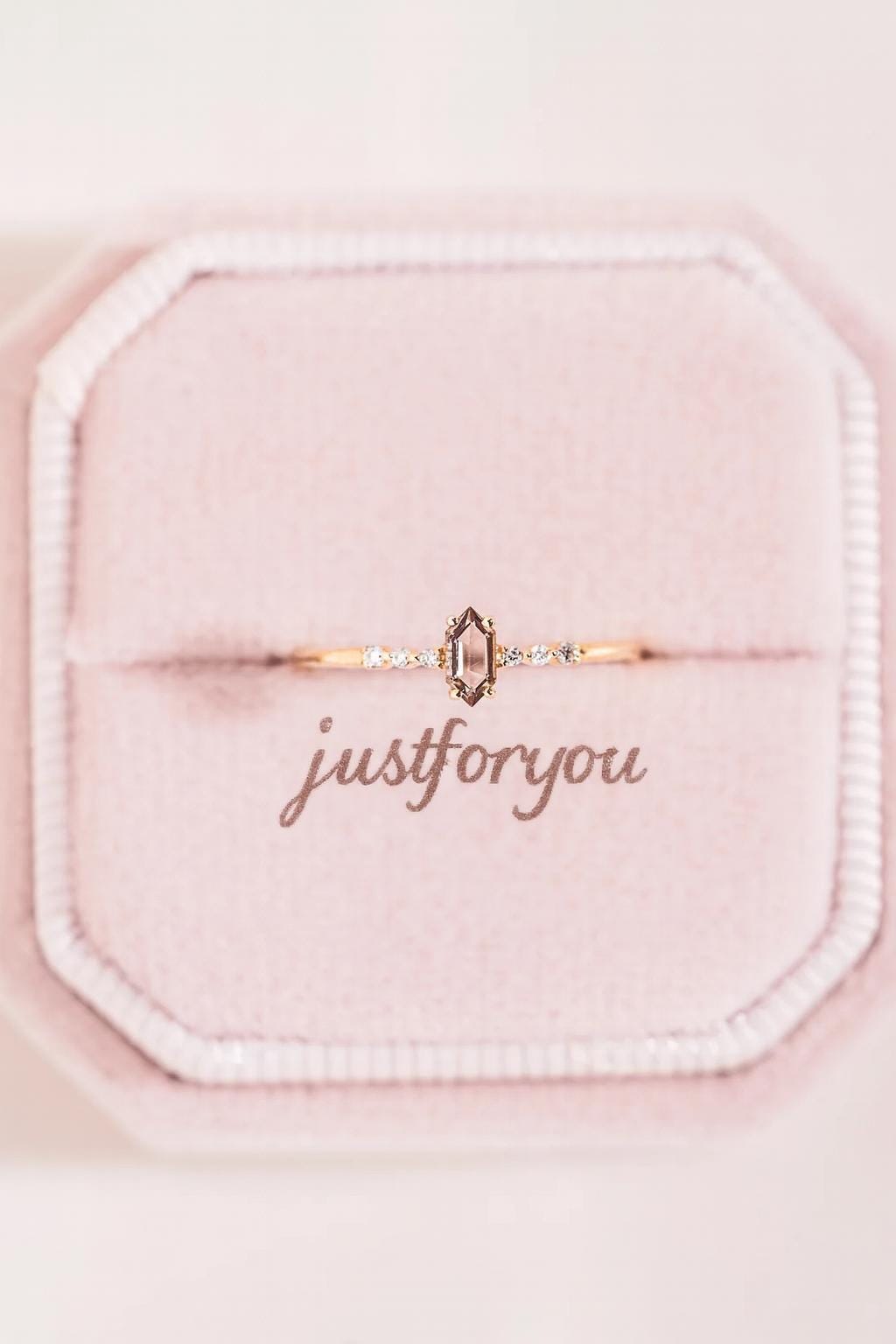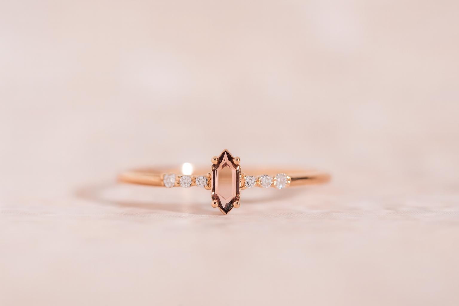 ✨ Details: • Metal: 925 Sterling Silver, 14K Rose Gold Plated • Main Stone: Morganite (Hexagon Cut) • Side Stones: White Cubic Zirconia • Band Width: 1.5 mm (approx.) • Hypoallergenic & Nickel Free • Handmade with high-quality craftsmanship