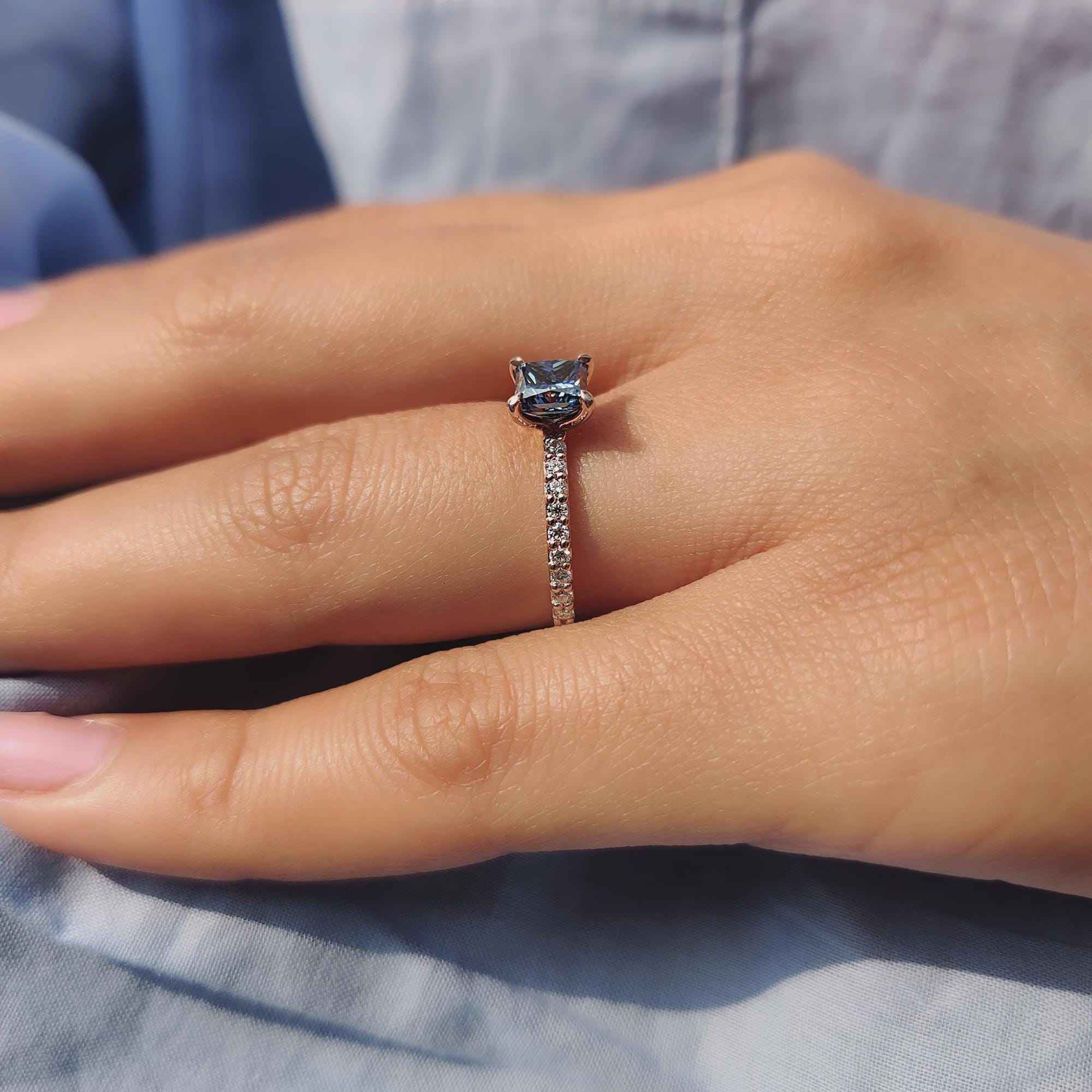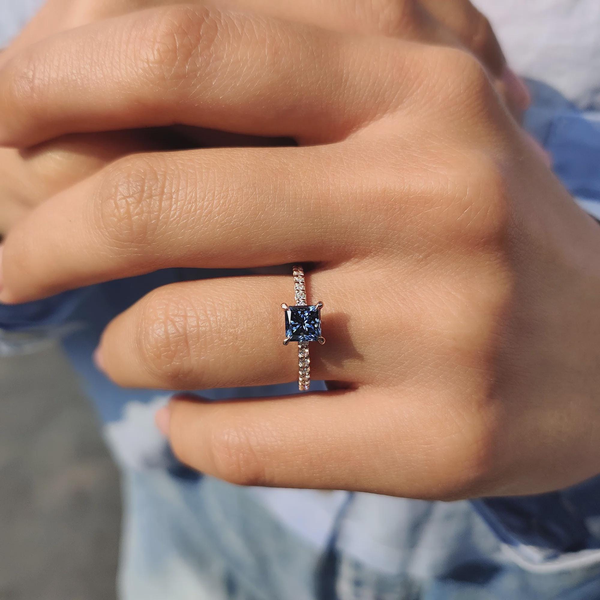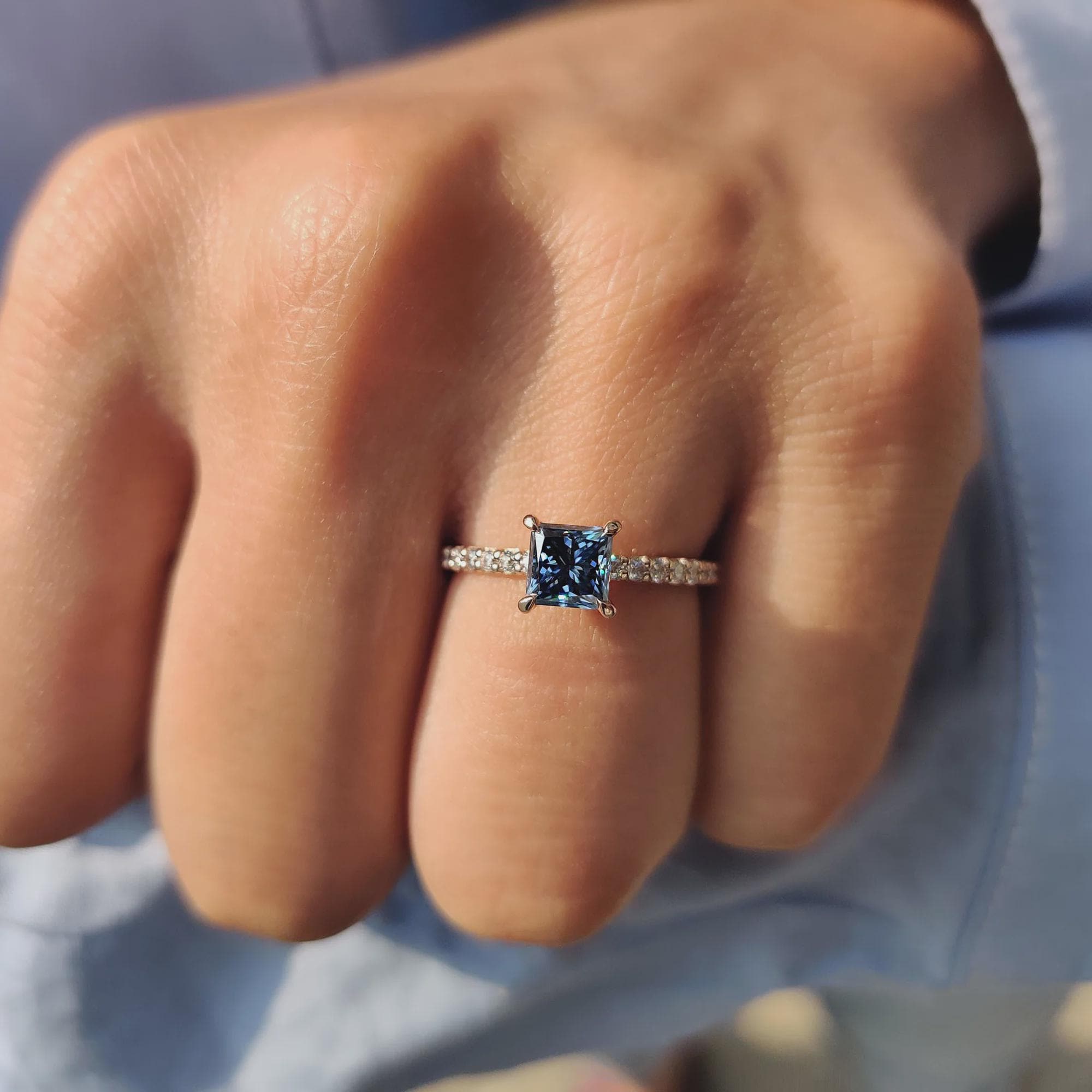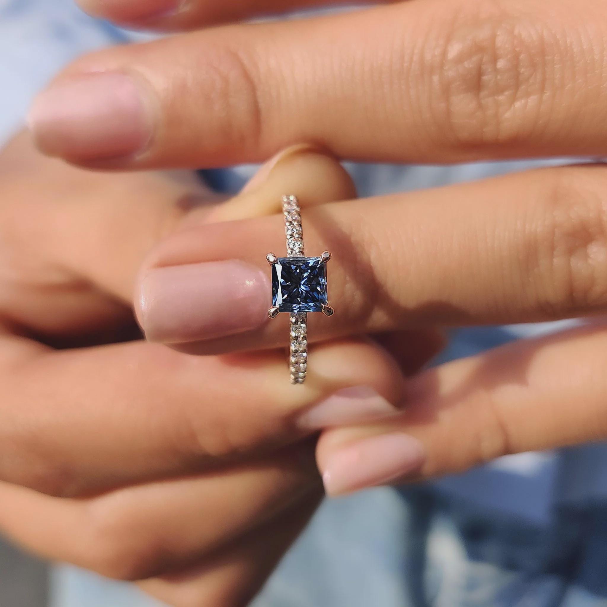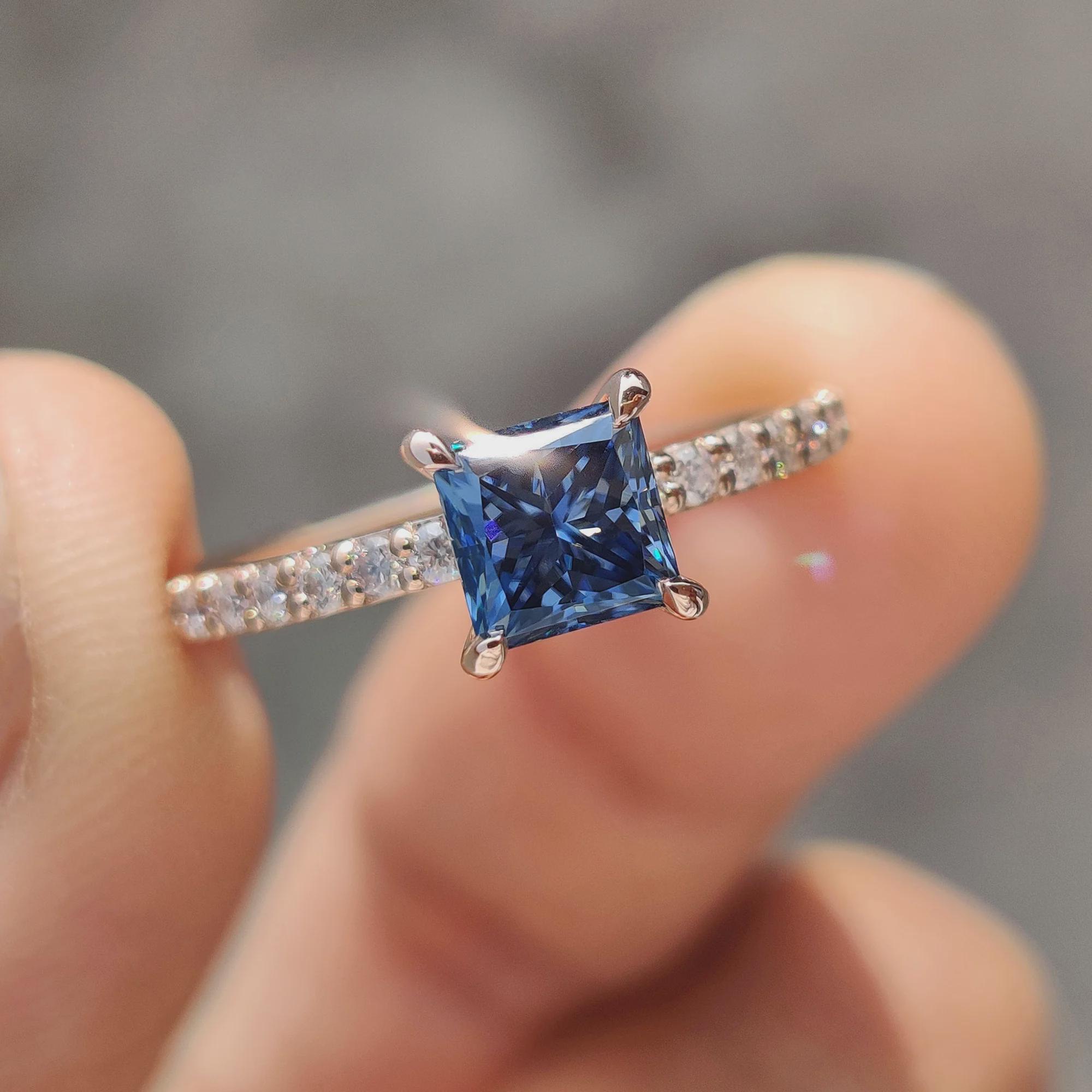 This stunning princess-cut blue moissanite engagement ring embodies elegance and modern charm. Crafted from high-quality 925 sterling silver, the ring features a shimmering blue moissanite stone set in a four-prong design, complemented by a delicate pavé band of brilliant white stones.