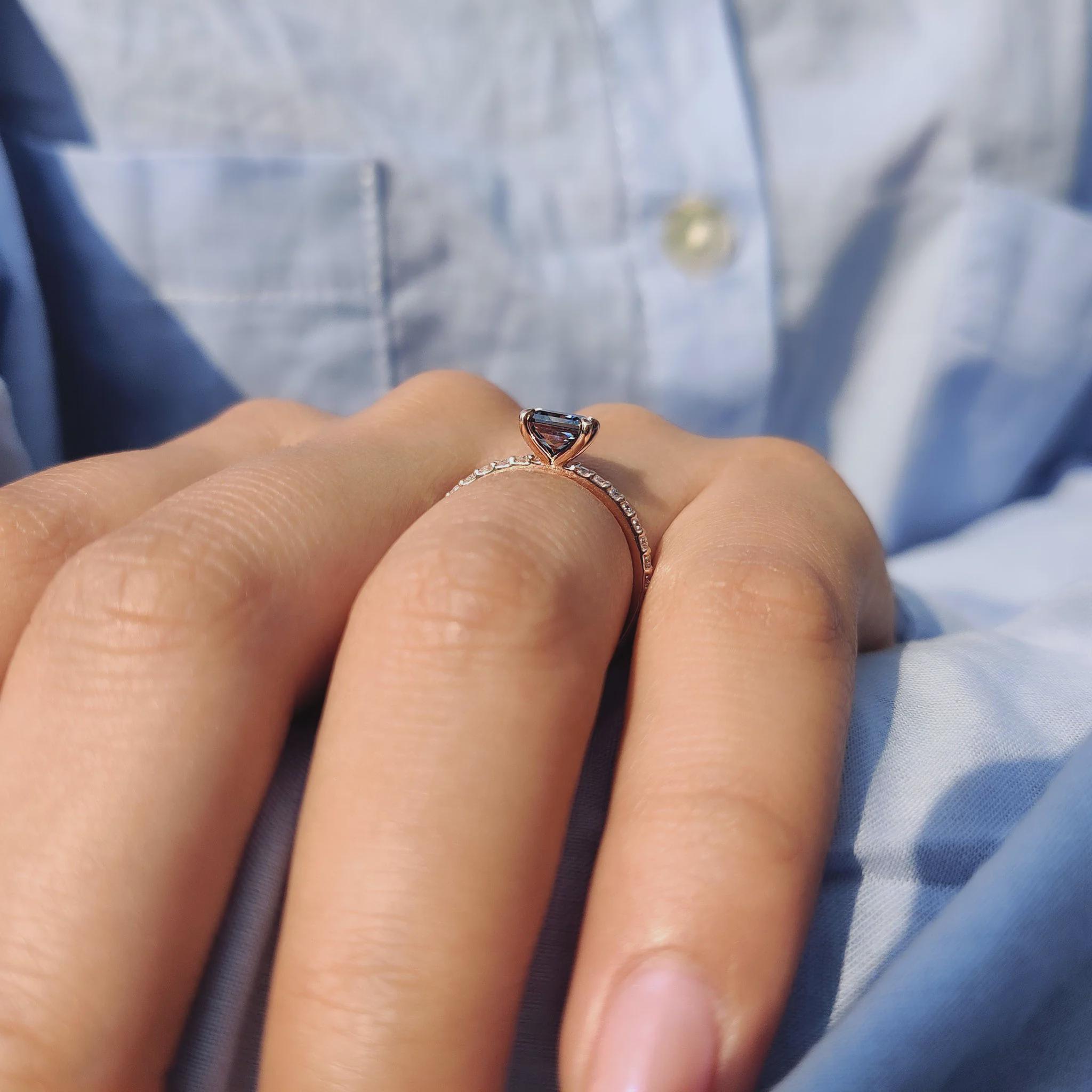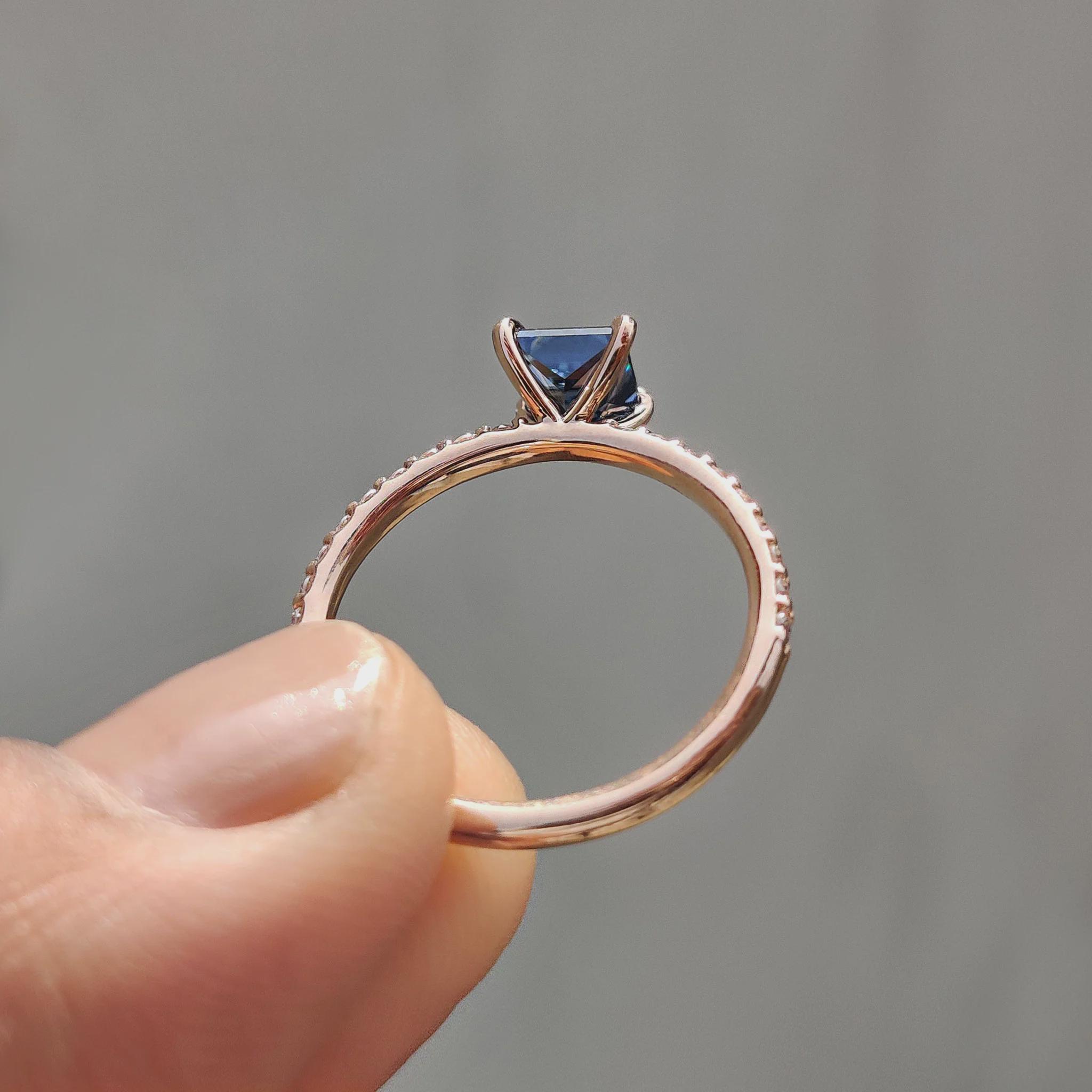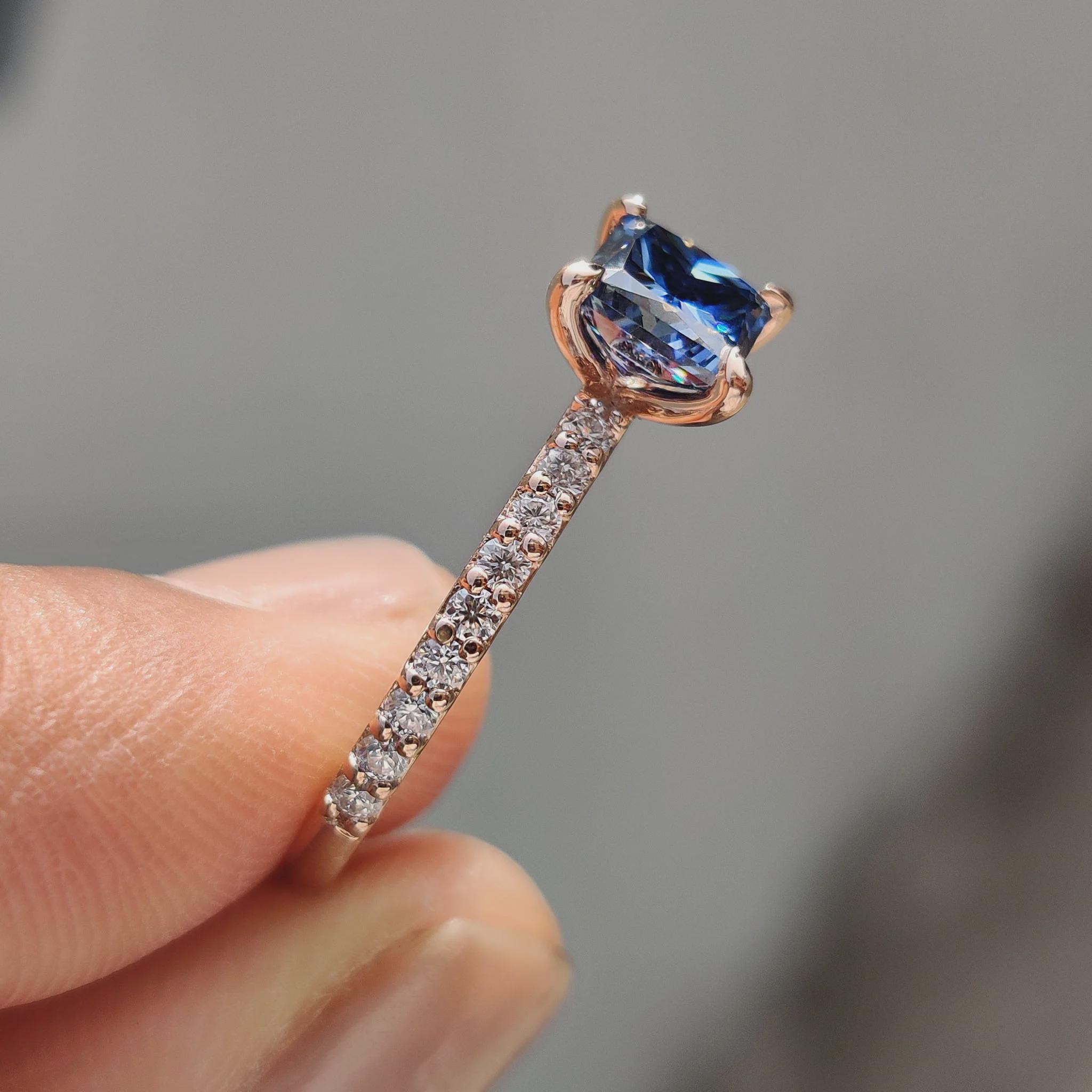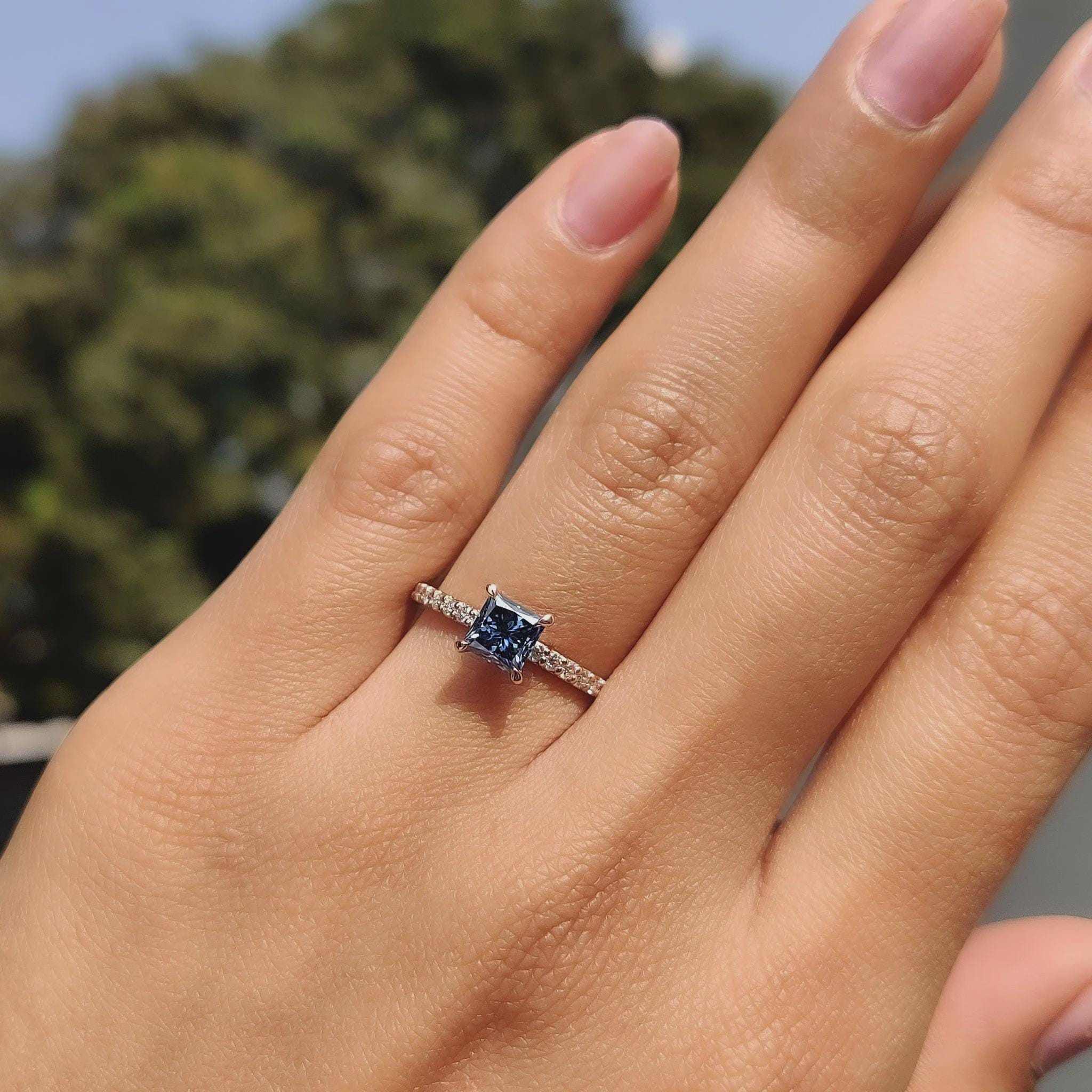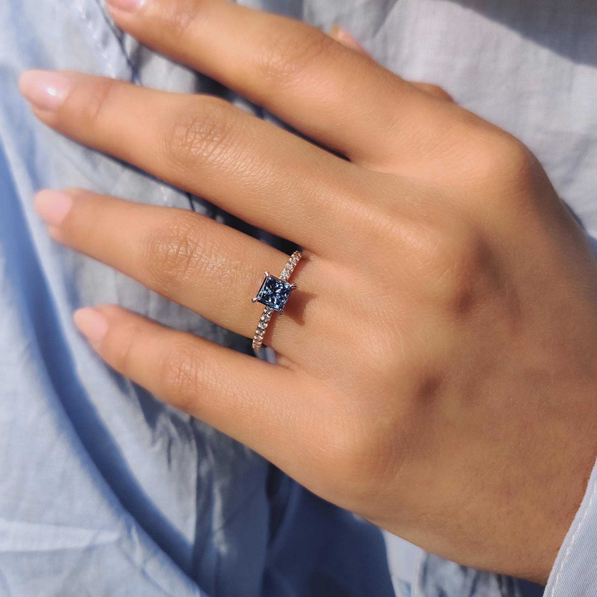 This stunning princess-cut blue moissanite engagement ring embodies elegance and modern charm. Crafted from high-quality 925 sterling silver, the ring features a shimmering blue moissanite stone set in a four-prong design, complemented by a delicate pavé band of brilliant white stones.