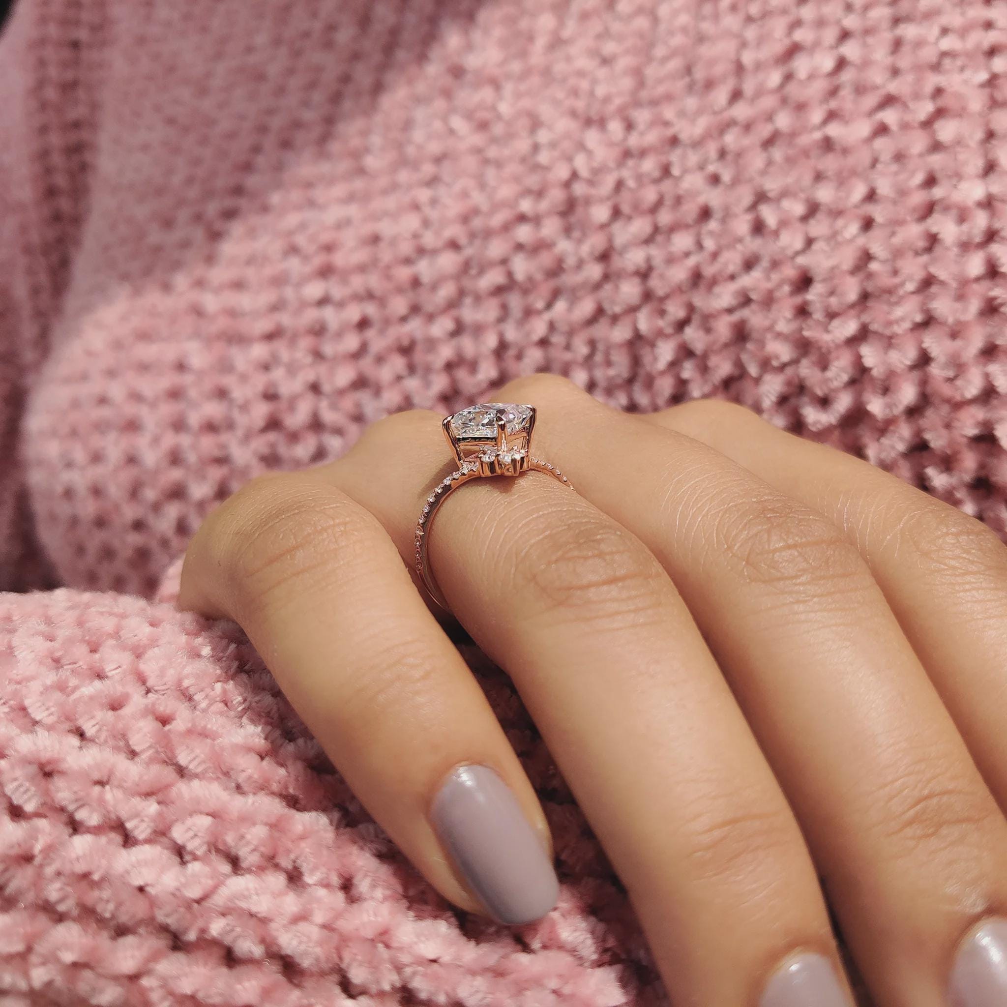 Made with a unique Compass Setting, this moissanite engagement ring holds the stone with precision and symmetry. In Fact, The round cut ring accents offer contrast and add a smooth, sparkling finish. A delicate Pave engagement ring detail brings extra shine to the band.