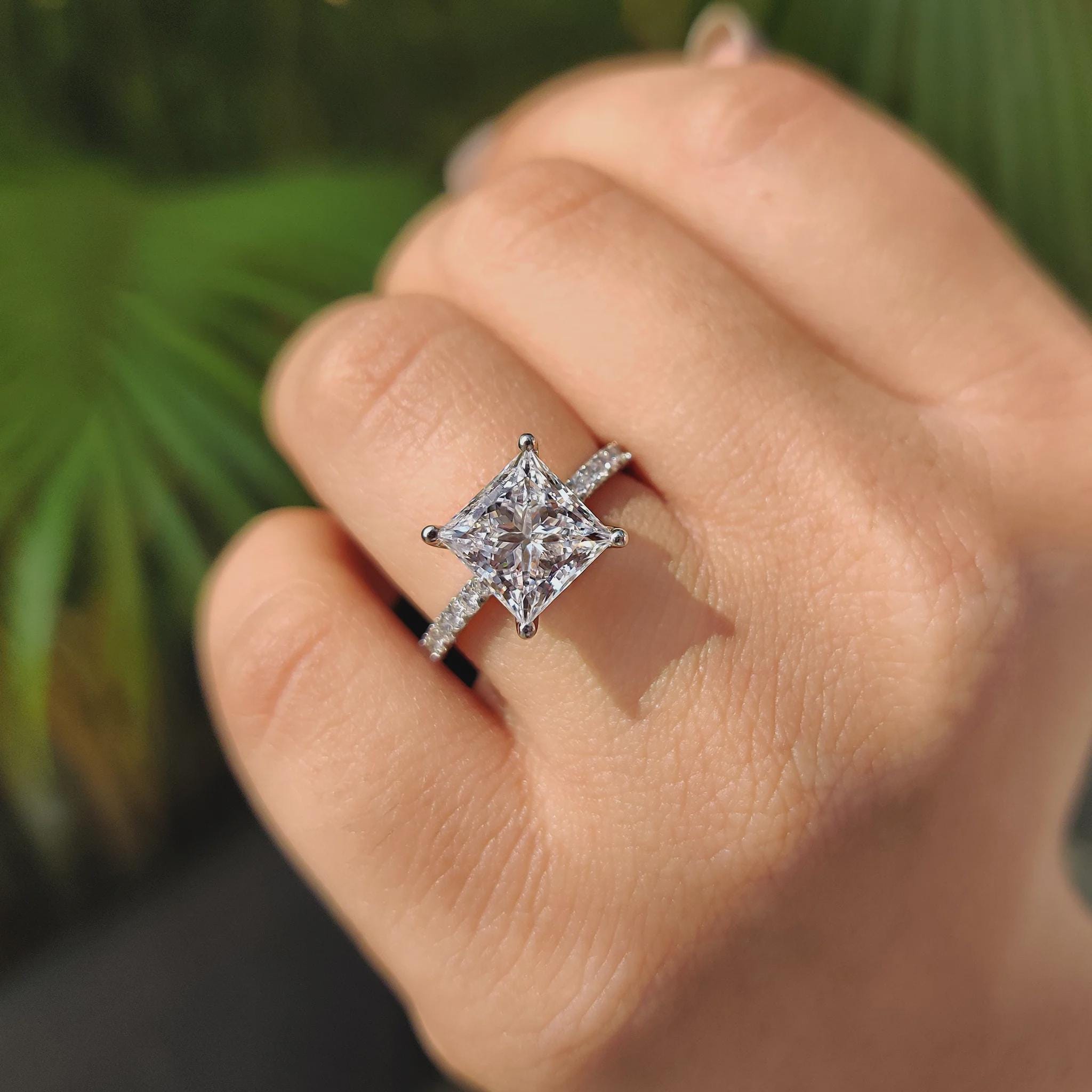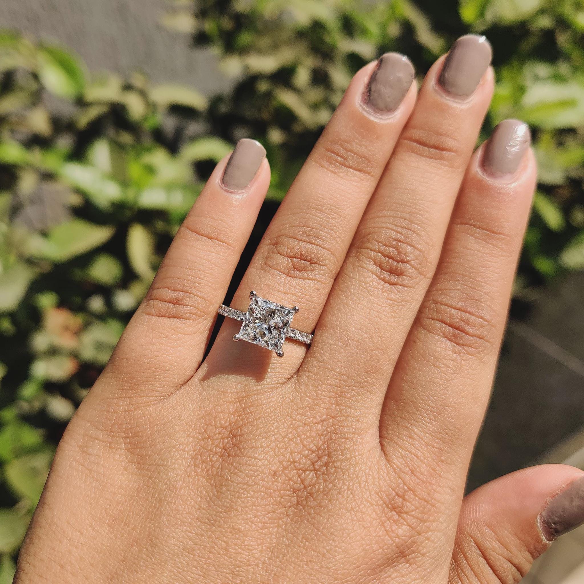 Description Designed with love and perfection, our beautiful Princess Cut Engagement Ring displays a brilliant white gold diamond ring with classic beauty. Made from lab produced diamonds and IGI certified stones, this handcrafted jewelry item stands for sustainability and excellence. Every carat diamond ring displays excellent workmanship and is a very distinctive sign of love when combined.