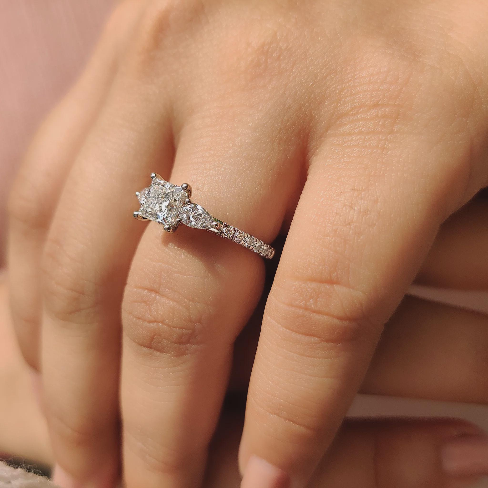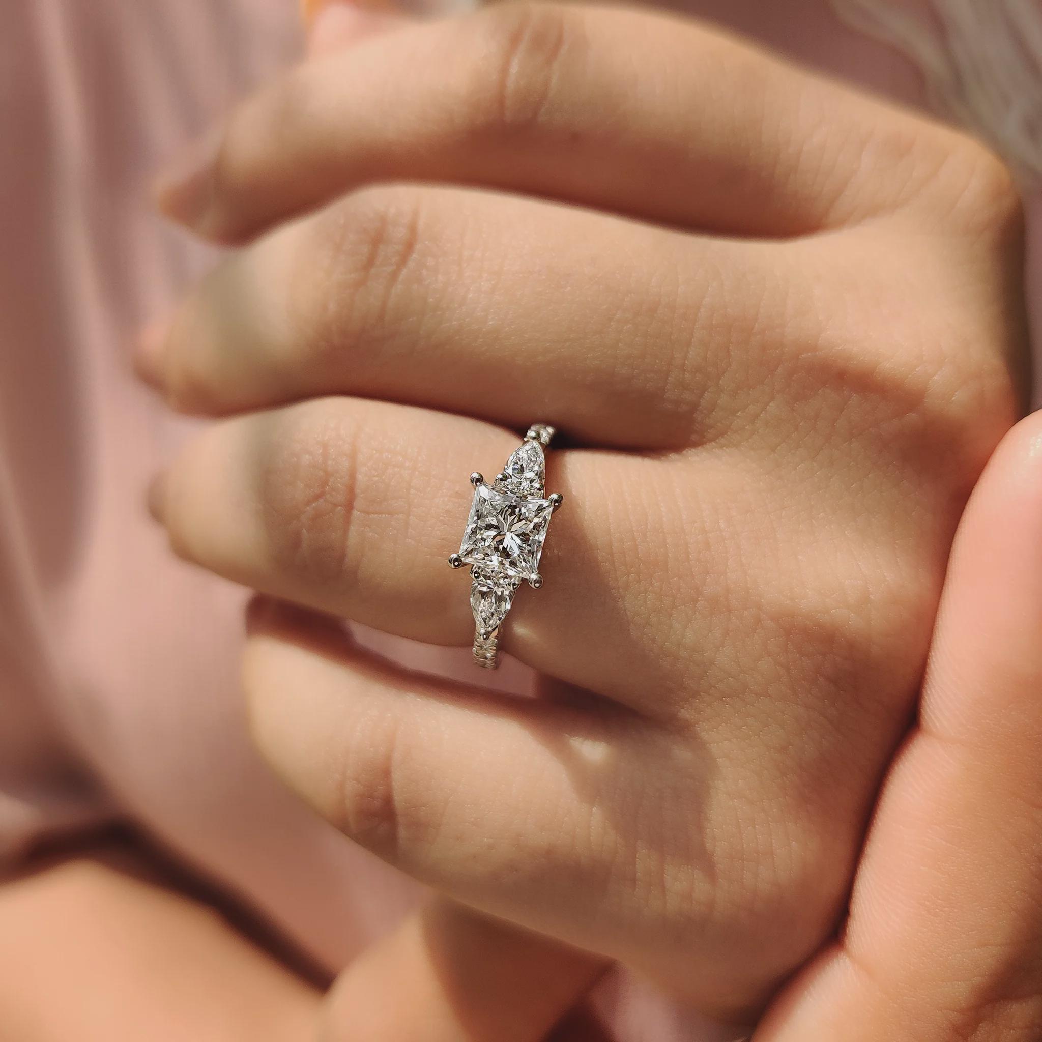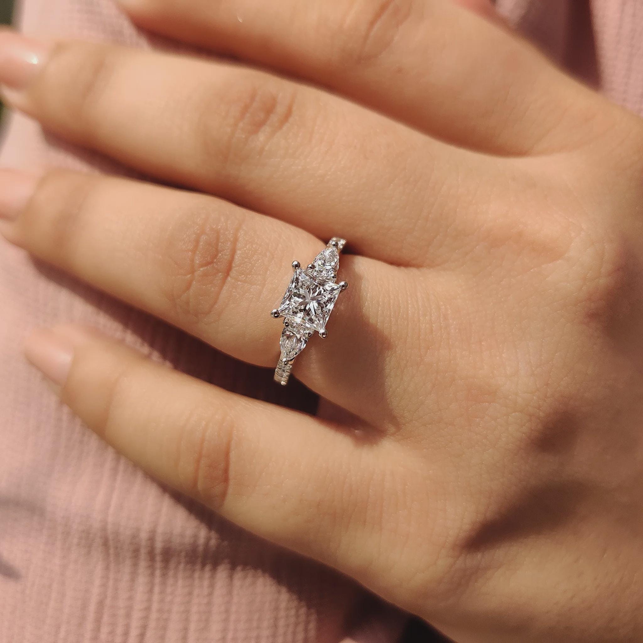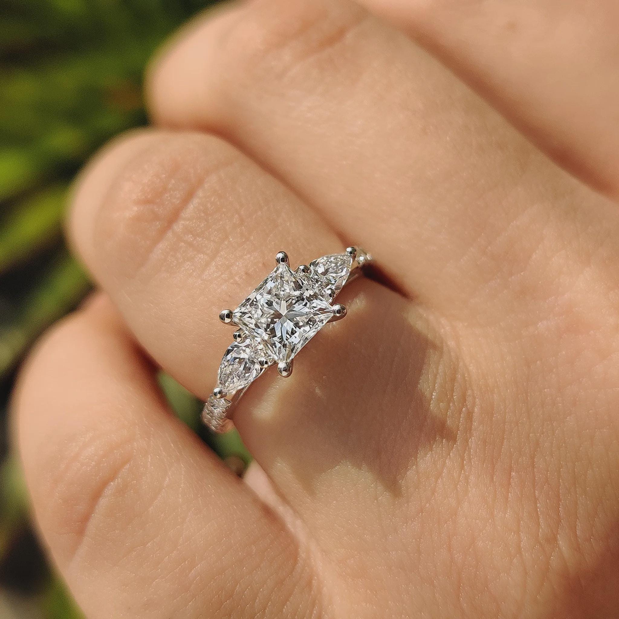 Stunning princess diamond ring with sharp facets for extra brilliance Enhanced by 2 pear side stone accents to increase sparkle Designed with a secure 4 prong setting for durability Features a classic cathedral setting ring that lifts the diamond beautifully Includes a round cut pave setting on the band for added shine This princess cut ring makes an unforgettable gift for your loved one. The unique sparkle from the carat diamonds ring and elegant cathedral ring setting shows your special commitment. Whether you buy an engagement ring for a proposal or an anniversary, this handmade jewelry piece symbolizes forever love. Its IGI certified quality ensures lasting beauty.