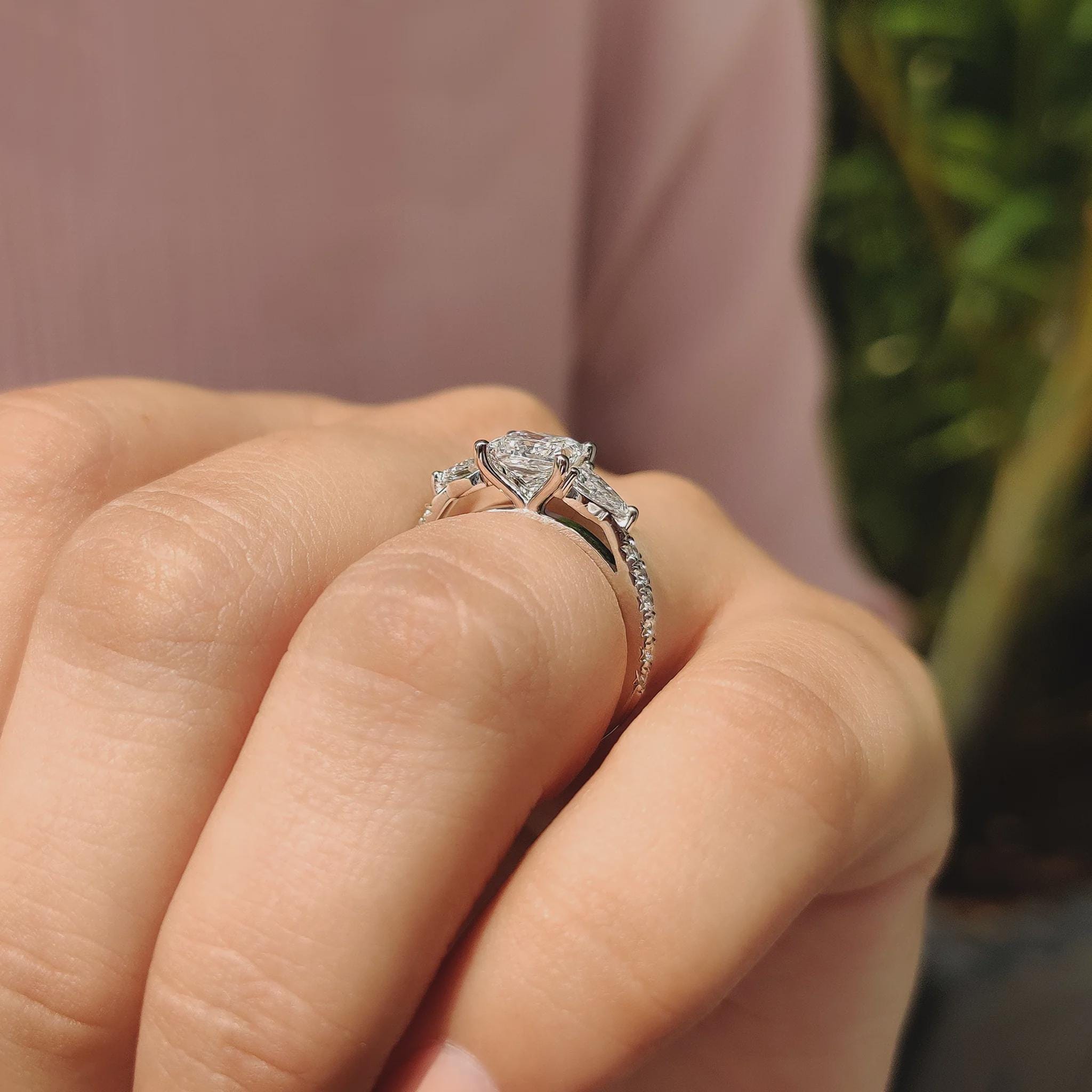 You can customize your princess cut diamond ring by choosing different carat sizes or adjusting the pave setting style. Our handmade ring services allow you to create a unique engagement ring that fits your style perfectly. Upgrade your carat diamonds engagement ring with 2 pear side stones or change the band finish. This white gold engagement ring is designed for your personal touch.