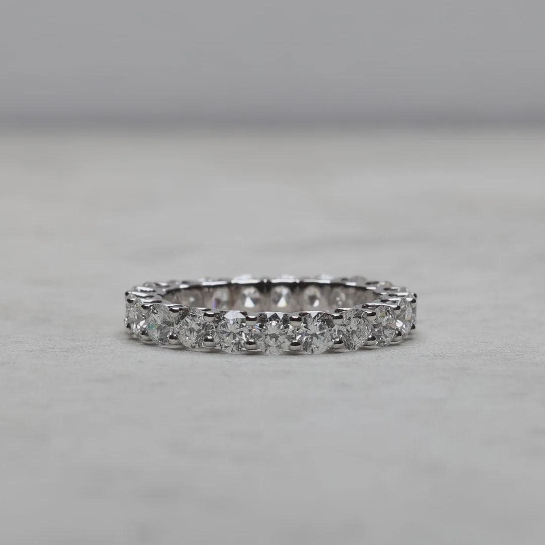 • Stone: Moissanite (Round Brilliant Cut) • Setting: Full Eternity / Shared Prong • Band Width: 3.0 mm (approx.) • Finish: High Polish • Hypoallergenic & Nickel Free