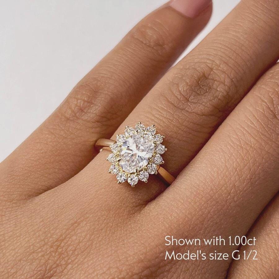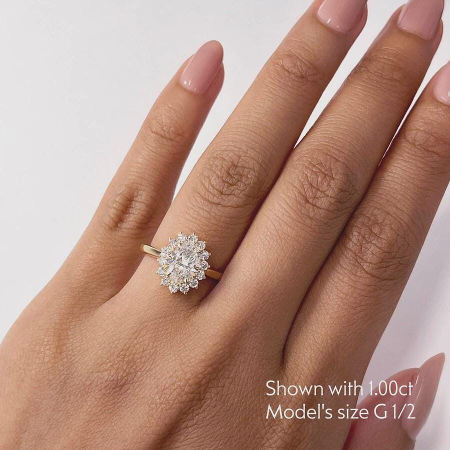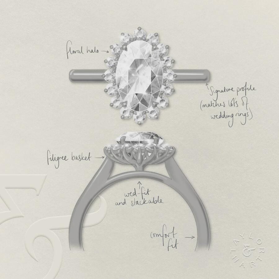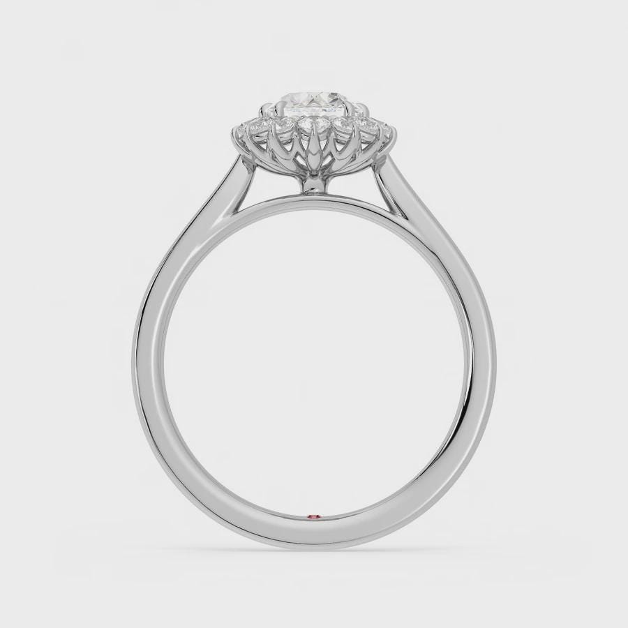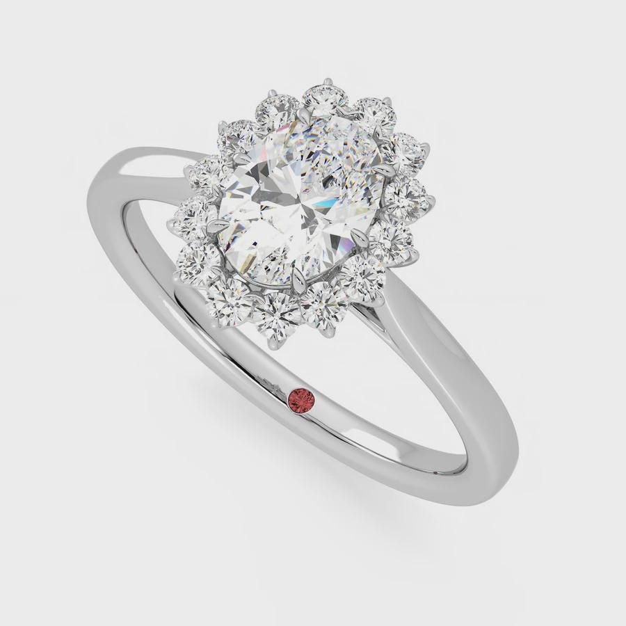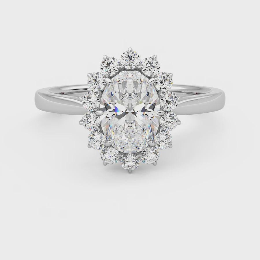 The Lira Ring is as captivating as the light of an elegant star. Set in platinum, the oval center diamond creates a magnificent sparkle with the surrounding floral halo of stones. Shining from every angle, this ring embodies classic romanticism with a modern edge.