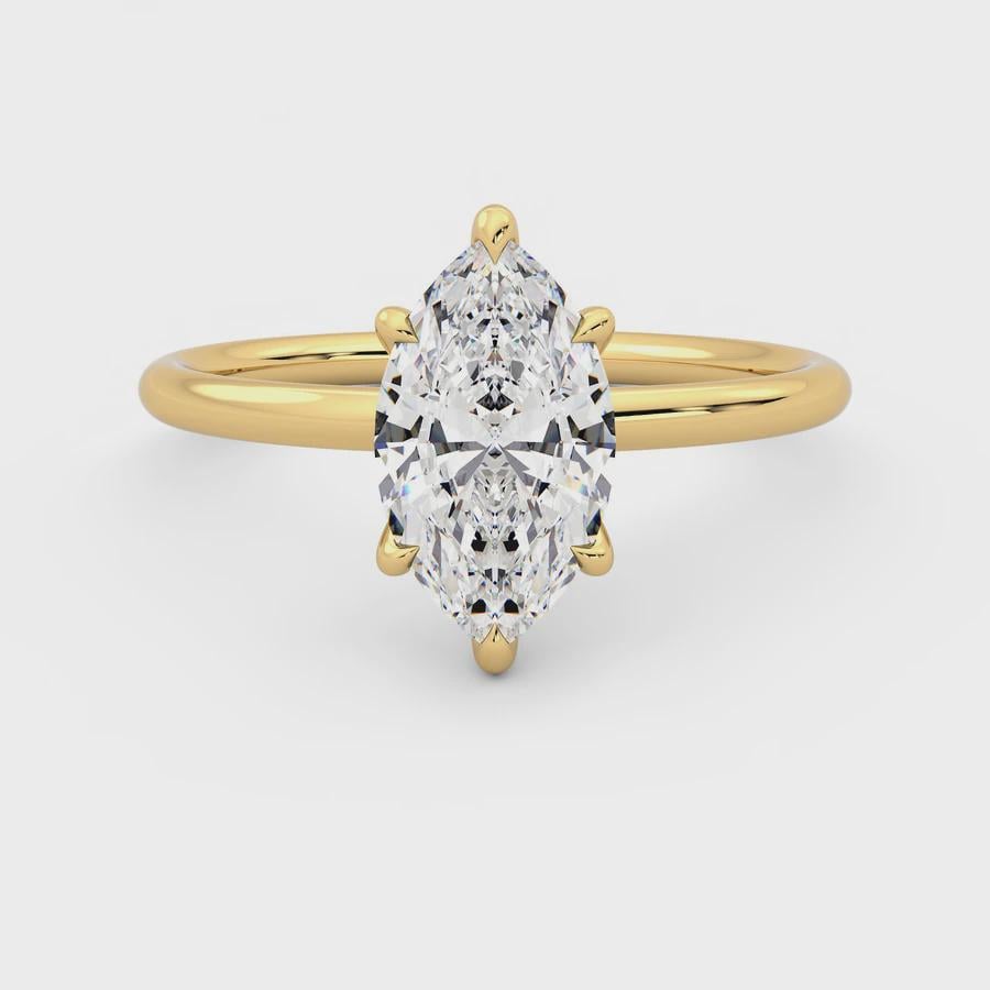This elegant ring offers timeless elegance with its marquise-cut diamond center stone set in 18-karat yellow gold. The elongated shape of the marquise stone adds a delicate elegance to the finger and captivatingly reflects the light. Its classic solitaire shape blends with modern, minimal lines to complement any style.