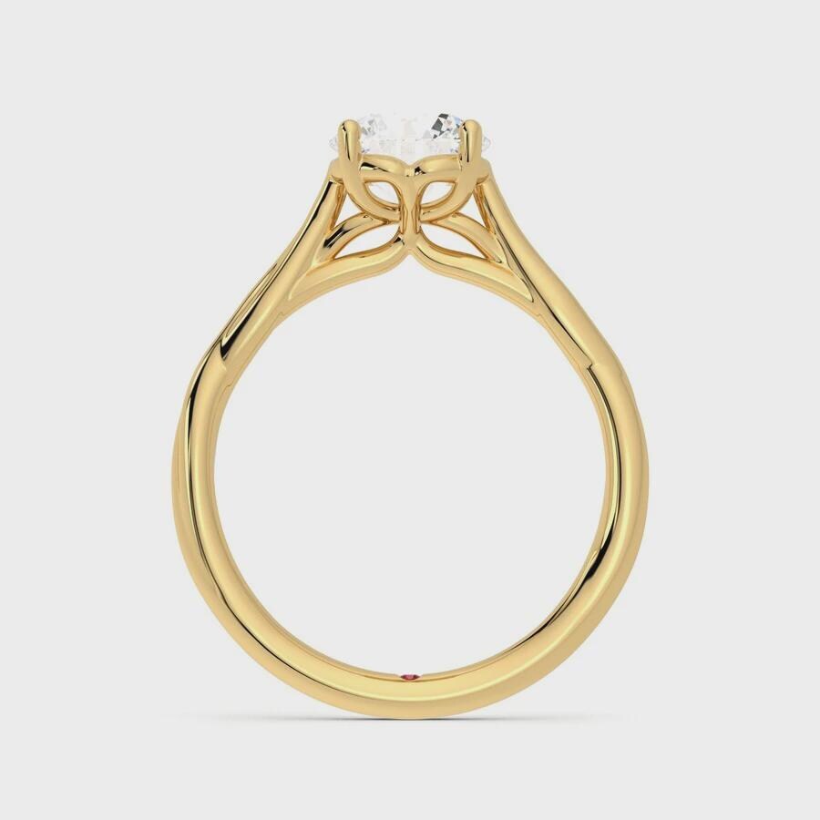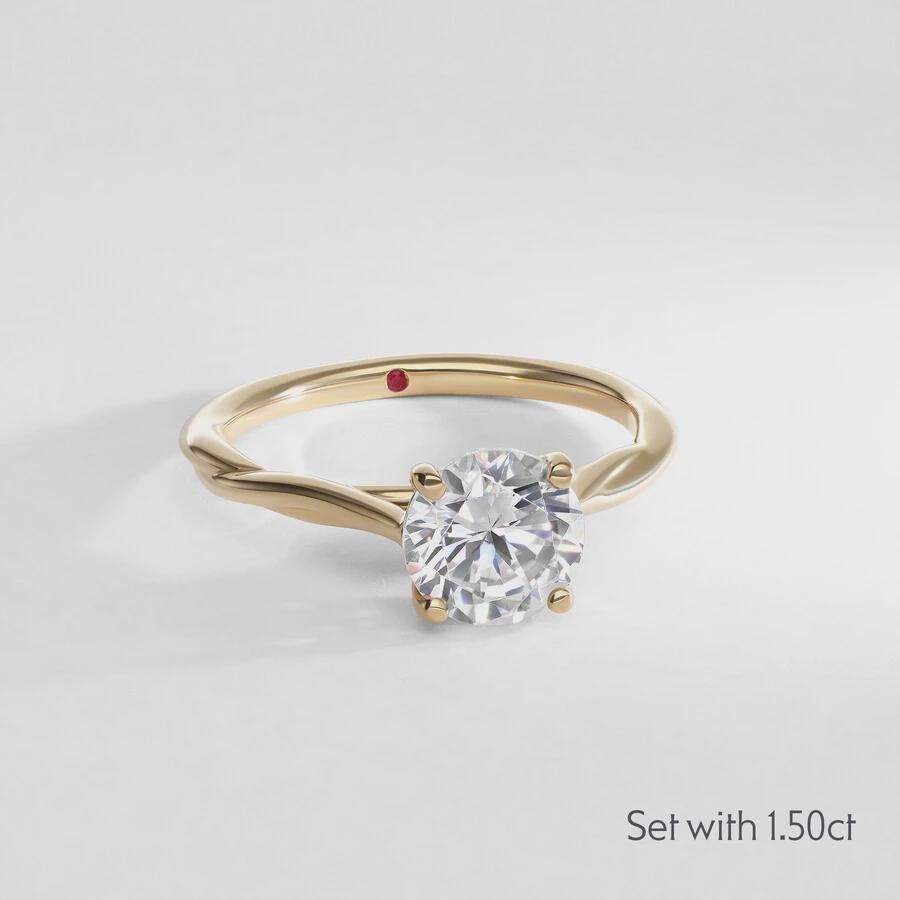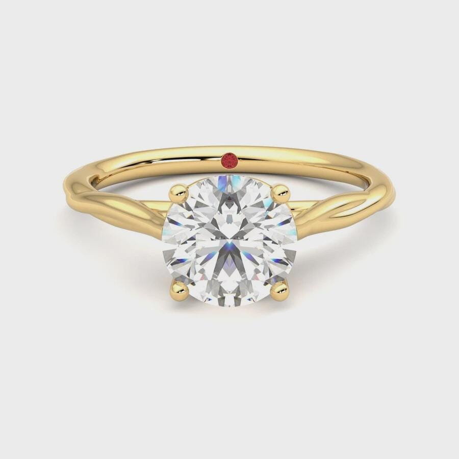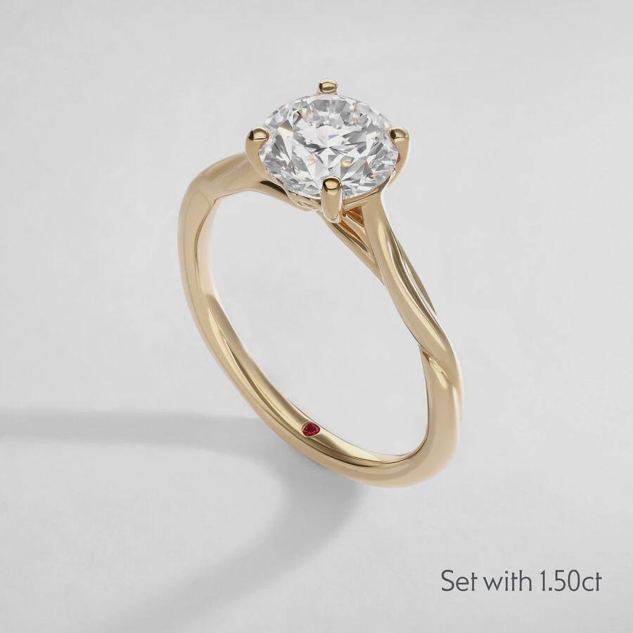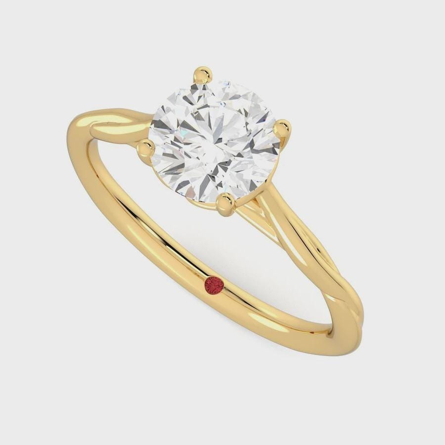 The Mariposa Ring is as delicate as a butterfly's wing in elegance, yet equally captivating. Handcrafted from 18-karat yellow gold, this ring boasts a dazzling sparkle with its centerpiece, a round-cut diamond (1.50 ct). The ring's twisted form symbolizes the intertwining of two hearts, while the distinctive red stone detail inside embodies the warmth of love.