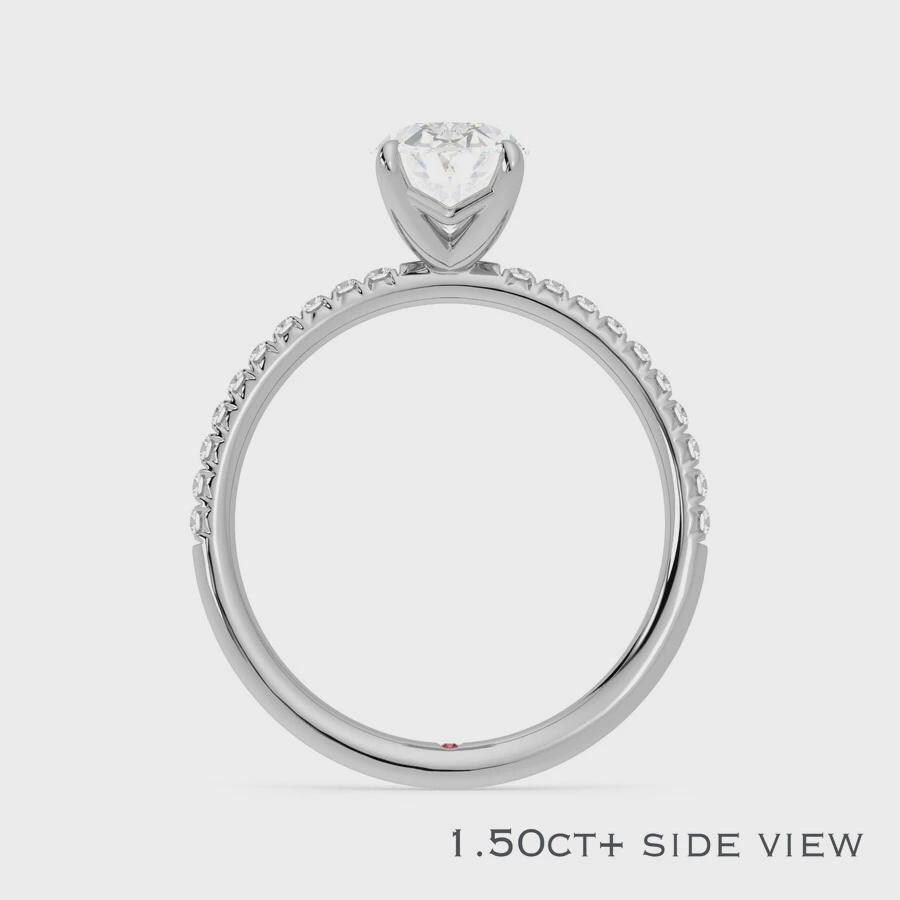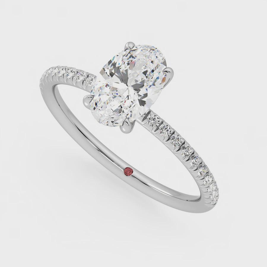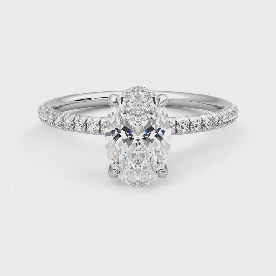 This elegant engagement ring embodies pure elegance with its oval-cut center diamond and fishtail pavé stone detailing, set in platinum.